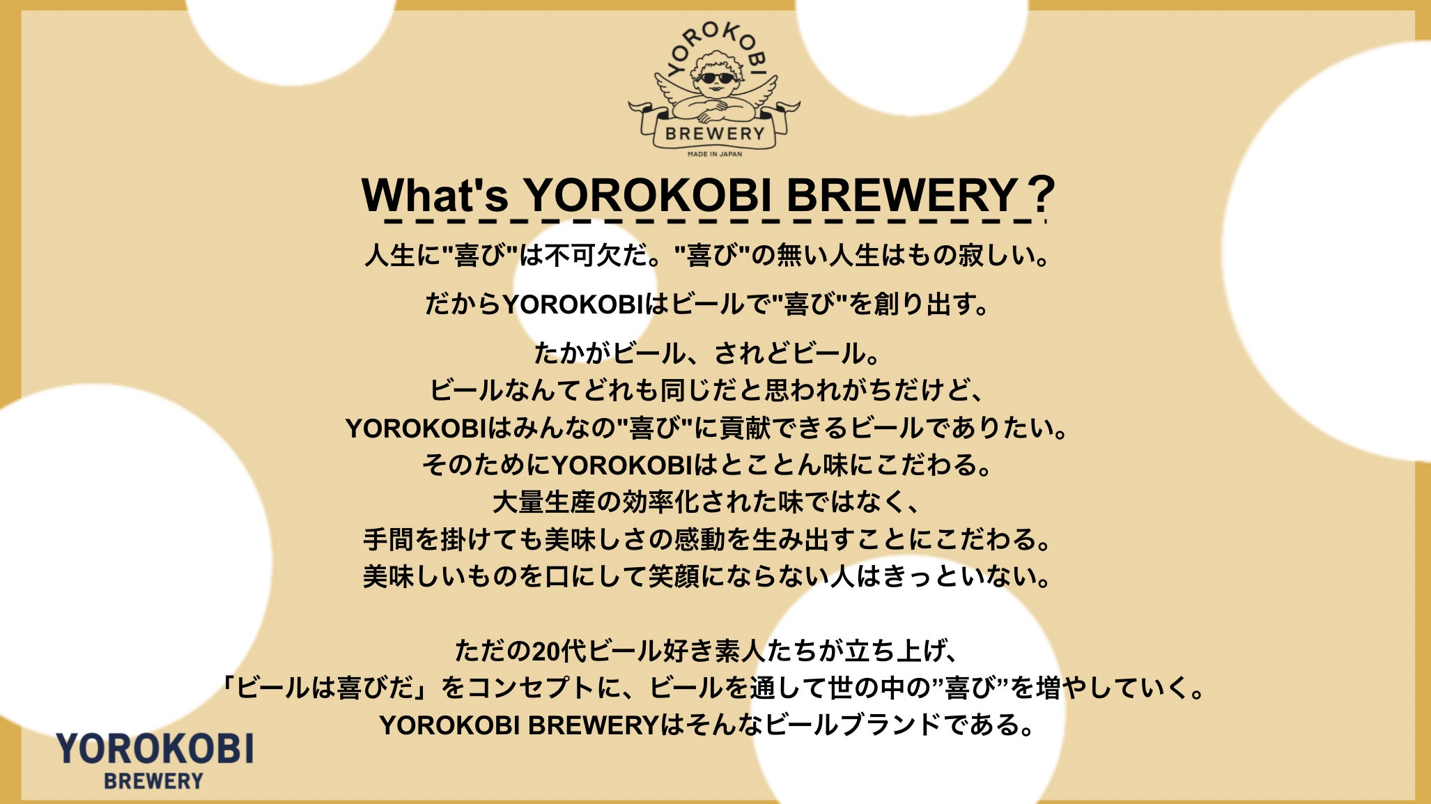 自分が世界とつながれた理由の一つである「ビール」を通して、今度は自分が"喜び"を人に与えたい。忘れることのない、世界中の友達との乾杯の時に感じた"喜び"をブランドネームにし、”YOROKOBI BREWERY”を立ち上げました。