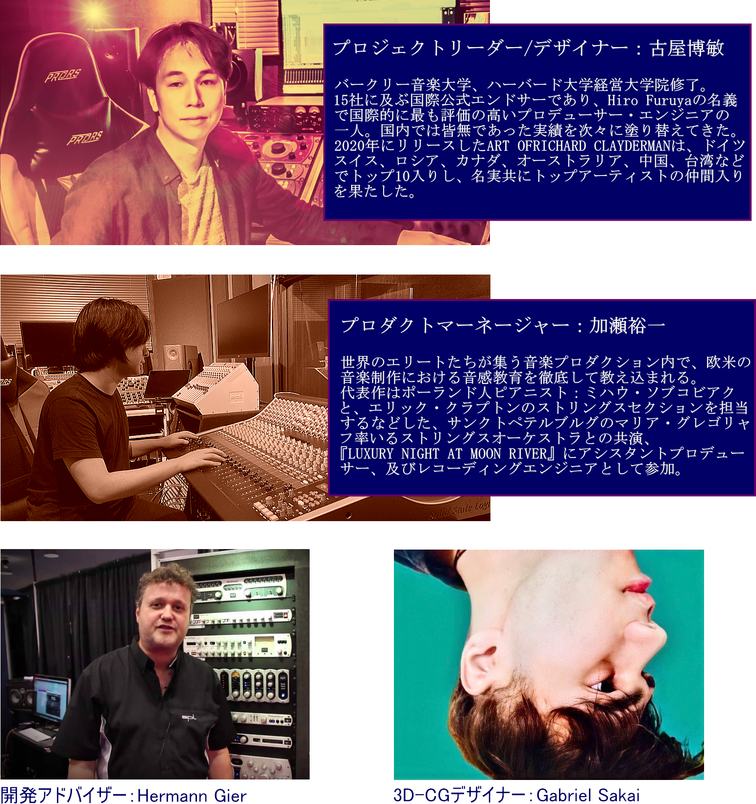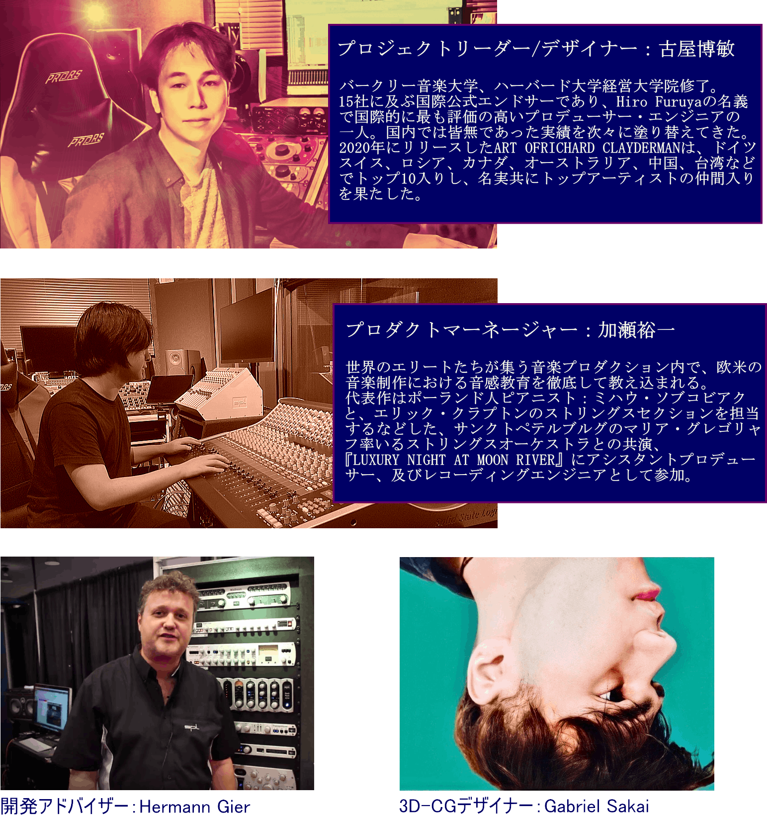 サウンドチューニングにおいては、当社がこれまでに築いてきた経験と人材が開発力を支え、技術的裏付けとしては2009年の上海万博におけるピアノ収録や、2018年ドイツにおけるワールドカップの公式曲をサウンドプロデュースやマスタリング、更には世界中のプロジェクトにおいて、ジョン・キャペック(TOTO、ダイアナ・ロスの作曲家)、セフィ・カーメル(映画ETの作曲家、フィル・コリンズのキーボーディスト)、チャック・サボ(エルトン・ジョンのドラマー)、ゼィブ・シャレブ(ロッド・スチュワートのギターリスト)など多数の共作を行い、 これ以上ない過酷な環境で積み上げてきたノウハウを投入すると共に、国際公式エンドーサーとして15社の契約を持つ中、その中でも関係性の深いアビーロードスタジオなどで多くの導入実績を有するドイツSPL社が開発に参加することで決定しています。世界中の音楽制作を通して感じてきた、多くのヘッドホンが存在したとしても、グローバルな音楽制作となると中々納得のいくものが無いという現実に対して、今回は自らの手で心から良いと思えるものを創り上げたいと考えています。また、世界のスーパーメジャーの音楽シーンというものを、身近に感じて頂けるかと思います。