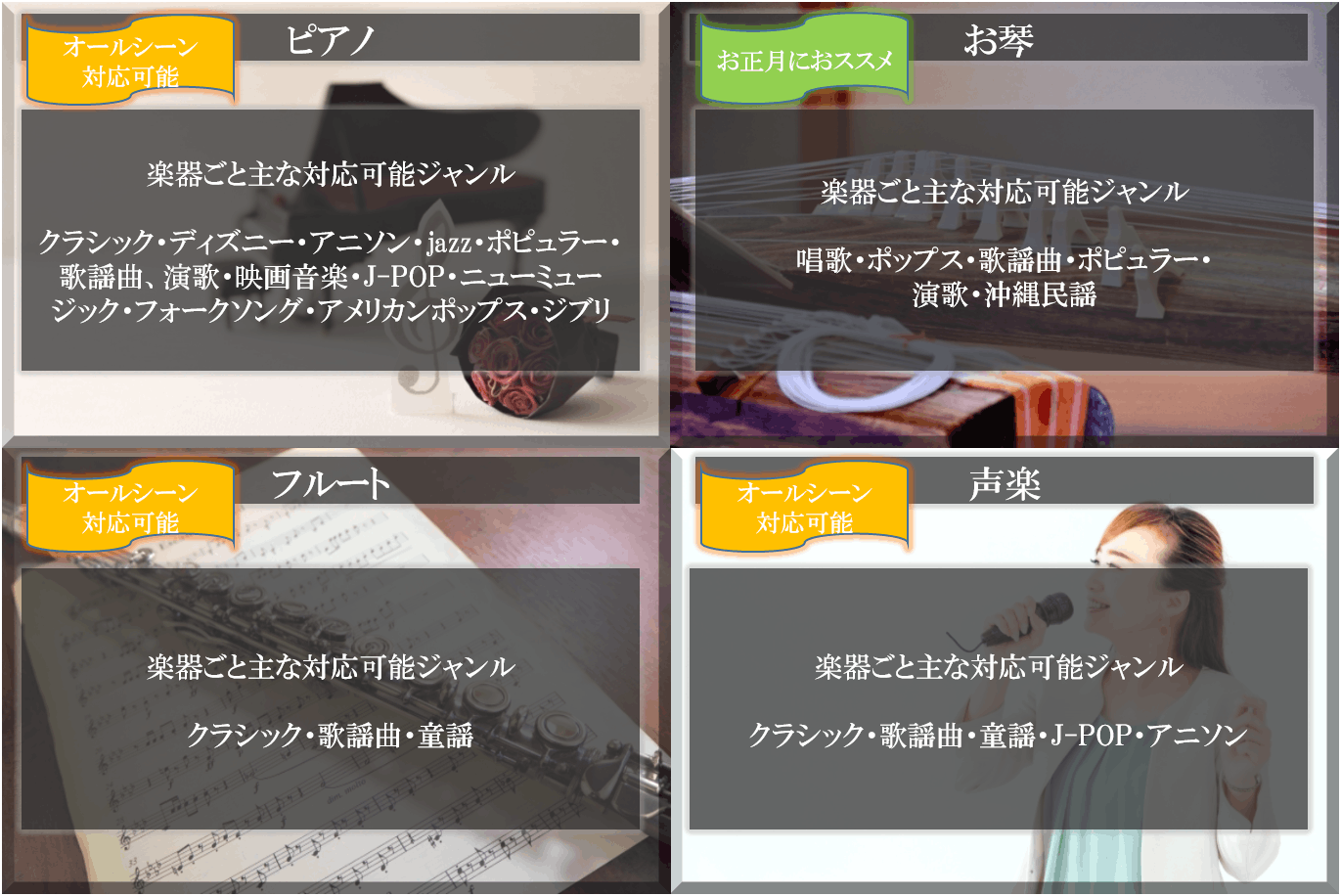 - 得意楽器や得意ジャンルなどからお選びいただけます。