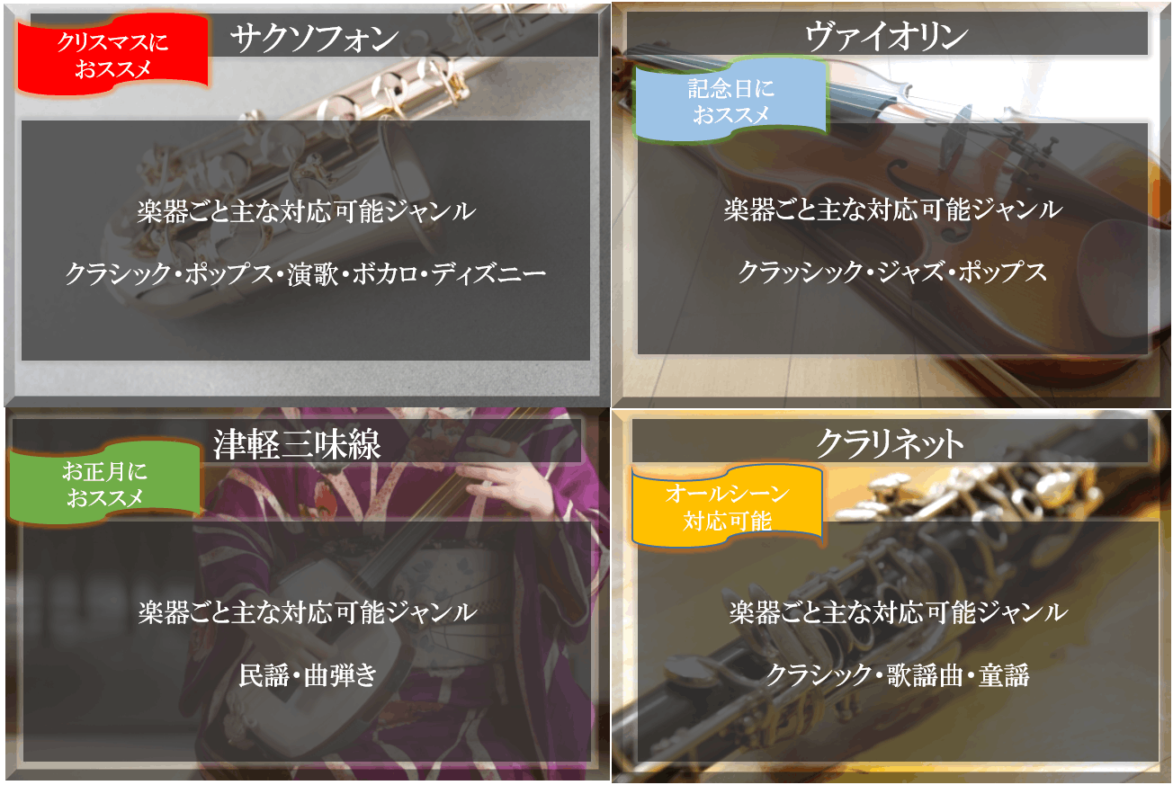 →基本的に365日24時間可能ではございますが、演奏可能な方が集まらない場合がございます。その際には、別途ご相談させてください。