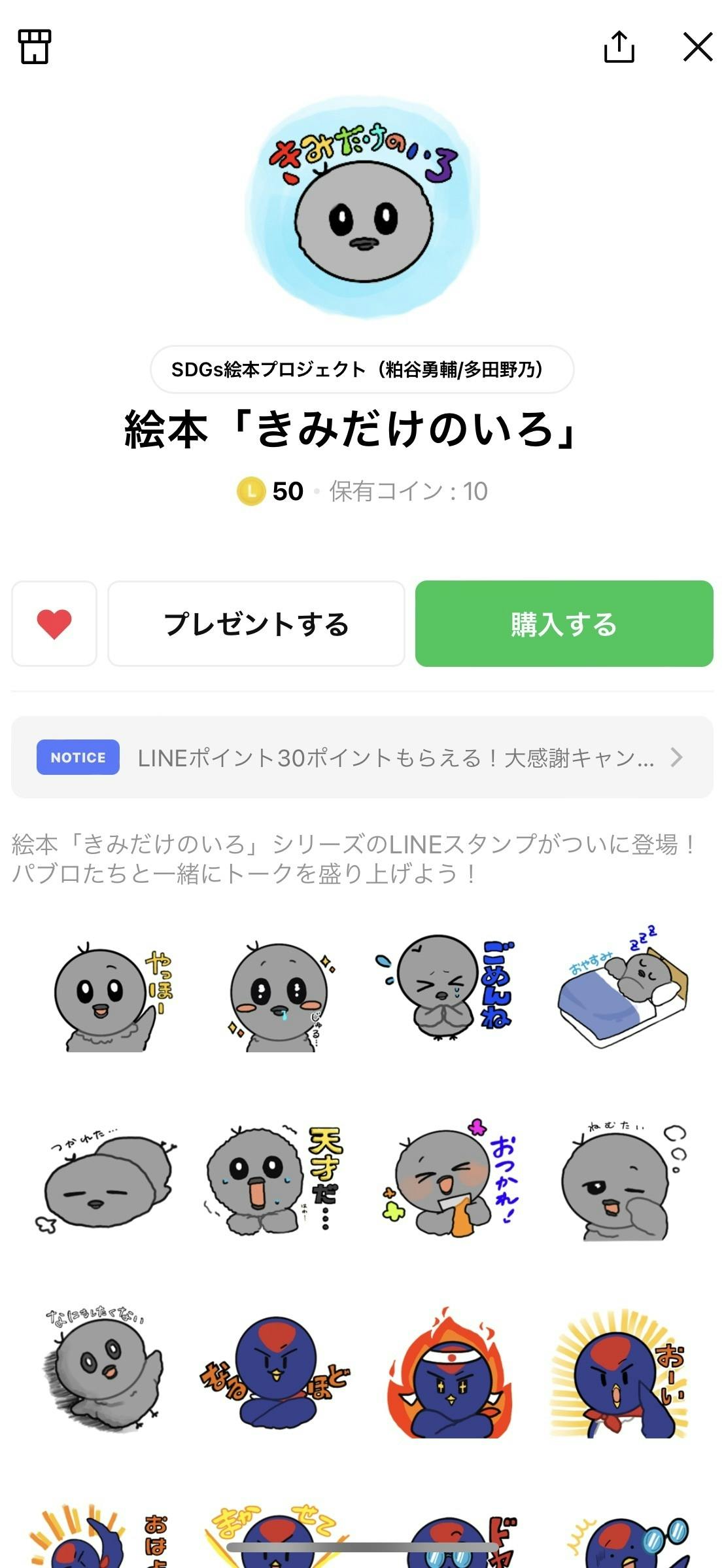 2023/12/31 17:19絵本「きみだけのいろ」LINEスタンプ販売開始みなさんお久しぶりです!今年も1年間ありがとうございました!本日は一点ご報告がございます!SDGs絵本プロジェクトで制作したLINEスタンプが販売開始となりました!絵本に登場するキャラクターたちの日常会話で使いやすいスタンプになってます!!以下のリンクから是非チェックしてみてください!https://line.me/S/sticker/25262199/?lang=ja&utm_source=gnsh_stickerDetail2021年に1作目となる絵本「きみだけのいろ 〜みんなちがうからみんないい〜」を制作して以降、2022年には2作目となる絵本「きみだけのいろ 〜みんなをすくうまほうのたべもの〜」、そして今年2023年にはLINEスタンプと、なんとか毎年何かしらのリリースをして終えることができました!この「きみだけのいろ」という絵本のおかげで、僕は色んな景色を見せて貰えたし、たくさんの人と出会うことができました!この絵本の制作に関わってくださった全ての皆様に感謝の気持ちでいっぱいです。来年からは社会人となり、このプロジェクトでの活動は暫く休止となりますが、またどこかのタイミングでスタンプの第2弾や絵本の3作目、それ以外にもなにかしらのリリースができる日を作れたらいいなと思ってます。引き続き、SDGs絵本プロジェクト、そして絵本「きみだけのいろ」をよろしくお願いします!それではみなさん良いお年を!! もっと見る