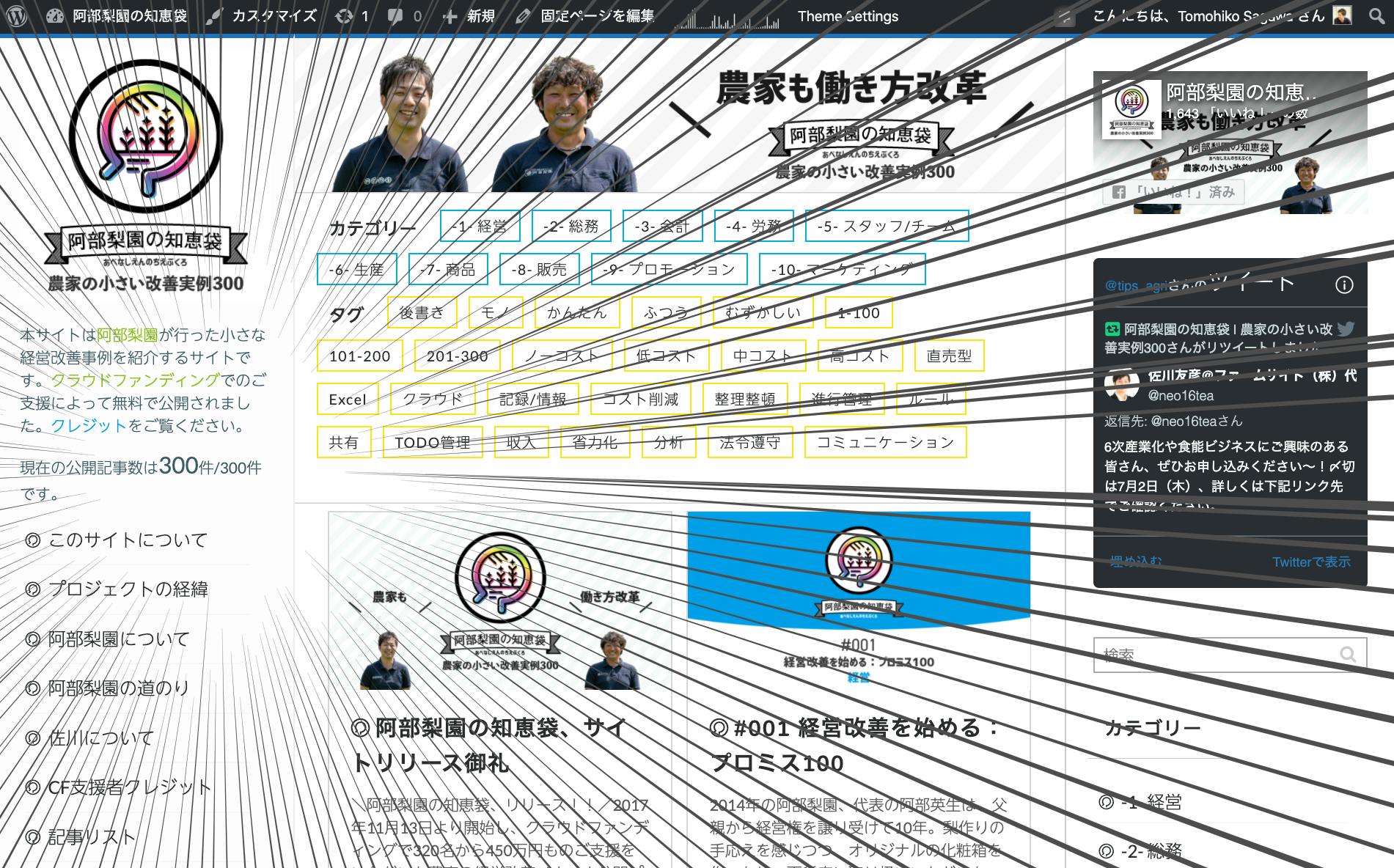 2020/06/29 17:18クラウドファンディングでご支援いただいた皆様、ご無沙汰しています。阿部梨園の佐川です。大変遅くなりましたが、阿部梨園の知恵袋は記事300本を書き終え、無事に完成いたしました。クラウドファンディング終了から約2年半、サイト公開から約2年、まだ終わってなかったの?という方もいらっしゃるかと思います。記事の執筆に必要な時間が見積もりより大幅に上回ったことと、話題や活動の広がりが想定以上であったことから、展開を優先させていただきました。大変長らくおまたせしました。やっと約束を果たせて、肩の重荷がひとつ下りました…涙まずは、この2年半のあいだにどんなことがあったのか紹介させてください。サイトリリース後の展開について(2018.05~)メディア等での拡散、オピニオン形成クラウドファンディング以来、77件(!)ものメディア掲載/出演がありました。様々な媒体の力を借りて、農業における経営改善の可能性やノウハウのオープン化など、私たちが伝えたいことを広く周知していただきました。結果として全国の同志に認知され、波及効果が生まれました。特に、堀江貴文さんのホリエモンチャンネルは大きな反響があり、業界外の方にも注目していただきました。2時間たっぷりの対談はぜいたくな経験です。その後、テレビ東京のサッカー番組FOOTxBRAINでも紹介していただきました。また、文春新書『農業新時代 ネクストファーマーズの挑戦』にも掲載していただきました。大変光栄です。こちらは、NEWSPICKSの特集「農業は死なない」で掲載していただいたインタビュー記事を、加筆修正して書籍化されたものです。農業新時代 ネクストファーマーズの挑戦 (文春新書) | イオ, 川内 |本 | 通販 | Amazon取材や掲載でご協力いただいた皆様、ありがとうございました。阿部梨園の知恵袋 | メディア掲載/出演メディアでの連載、寄稿もご依頼いただいており、現在は地上(家の光協会)、農業ビジネスベジ(イカロス出版)で連載させていただいています。過去にはスマート農業360やマイナビ農業などでも連載していました。講演・セミナーでの全国展開阿部梨園での改善事例や知恵袋PJを紹介する講演依頼を多くいただくようになりました。2018年は50回、2019年は75回、新型コロナの影響がありつつも2020年の6月までで150回(!)登壇いたしました。産地にご招待いただいて各地の生産者さんや農業関係者の皆さんとと直に意見交換し、SNS等でネットワークを拡げることができました。私たちにとっても非常に有益な機会になっています。また、各地の農業経営塾にも登壇し、経営戦略などのテーマをシリーズで担当させていただくようになりました。阿部梨園の知恵袋は小さなtipsを羅列したものですが、シリーズ講義では理論を体系的に再構成することができました。佐川個人としては、小規模農業が予算の都合でコンサルティング等の外部支援を受けられないのであれば、なおのこと「教育」がキーになると感じています。様々なテーマでご依頼いただきながら、幅広いコンテンツを制作することができました。コミュニティ形成クラウドファンディング終盤でコミュニティ形成を目的に掲げました。単独開催よりも企業等との共催のほうが参加者や企画の幅を広くとれると考え、マイナビさんと定期開催している「農家の課題解決ゼミ」やfreeeさんと共催した「農業経営MTUP」などで、生産者と農業関係者が課題解決を軸につながる場を創出してきました。知恵袋PJや農家の経営改善に限定したコミュニティを作るかどうかは諸々を見極めて判断したいと考えています。(参考)農業界における情報のオープン化、プラットフォーム、コミュニティに関する覚書|佐川友彦/ファームサイド(株)代表取締役/阿部梨園|noteファームサイド株式会社設立阿部梨園の知恵袋PJを進めるにつれ、多くの生産者さんの課題や悩みに触れました。次は業界全体の課題解決に事業としてべきだという考えに至ります。そこで2019年1月から佐川が阿部梨園での勤務を減らしてパートタイムになり、自身の事業として**ファームサイド株式会社**(旧FARMSIDE works)を起業しました。講演やセミナー、コンサルティング、執筆活動などはファームサイド社名義で展開しています。ファームサイド株式会社 – FARMSIDE Inc.|佐川友彦|農業界の課題解決できたこと、できなかったこと経営改善というオピニオンを立てた達成度:★★★★★これは十分に達成できたのではないかと感じています。大規模化、法人化、機械化、IT化…するしかないと言われていた農業においても、既存資源の価値を最大化する「経営改善」が効果的であると認知形成できたのではないでしょうか。阿部梨園での事例が何らかの共通言語になっているのであれば、議論を加速するお手伝いができたかもしれません。体感では「経営改善」というワードを業界のメディアやSNSの投稿などで目にする機会も増えたように感じます。農業経営の暗黙知をオープン化した達成度:★