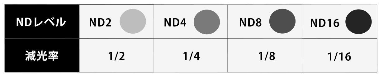 NDフィルターには「ND4、ND8…」といった番号がついていますが、これは光の量を何分の1に減らすかを表しており、番号が大きいほどフィルター濃度が濃くなり、減光量が大きくなります。