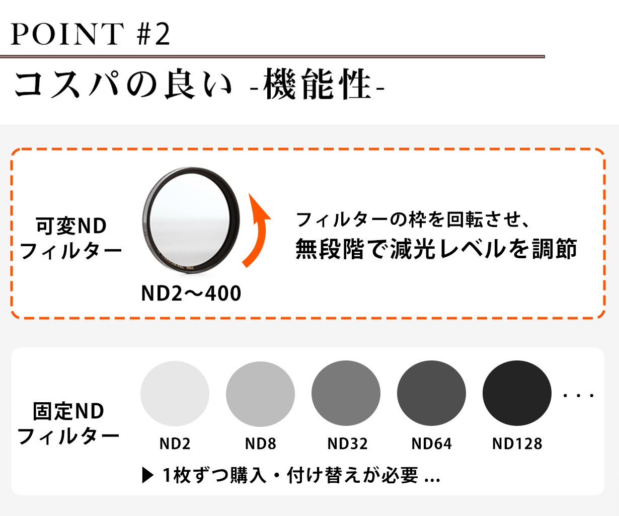 通常のNDフィルターの場合、濃さの違うフィルターを1枚1枚購入したり、撮影状況によって濃さの違うフィルターを付け替える必要があり、コストと手間がかかってしまいます。