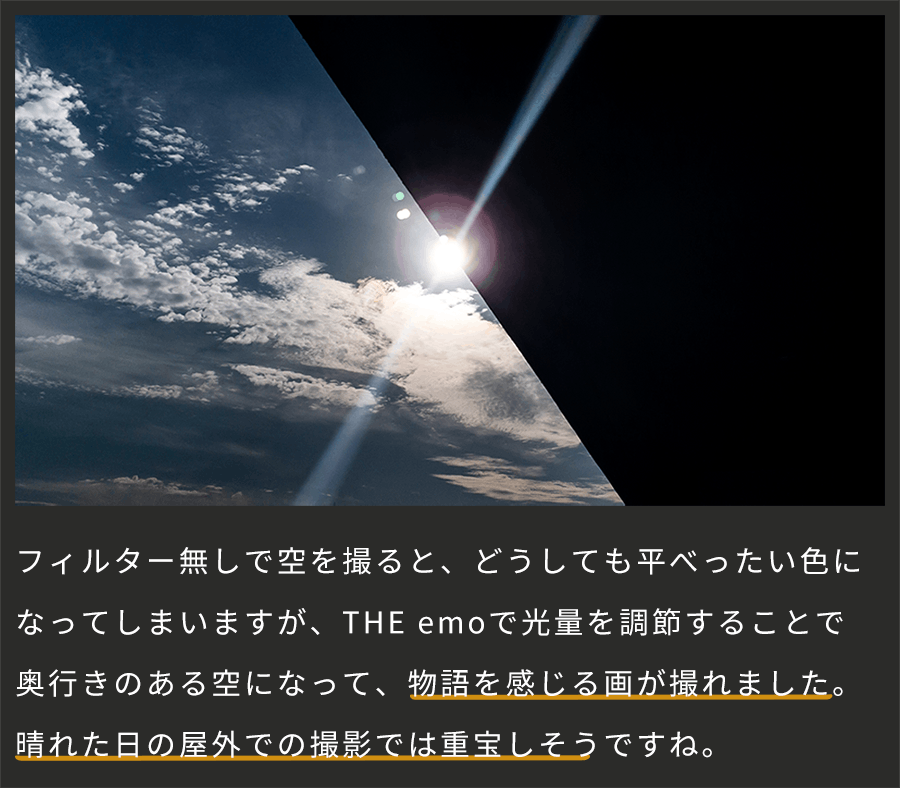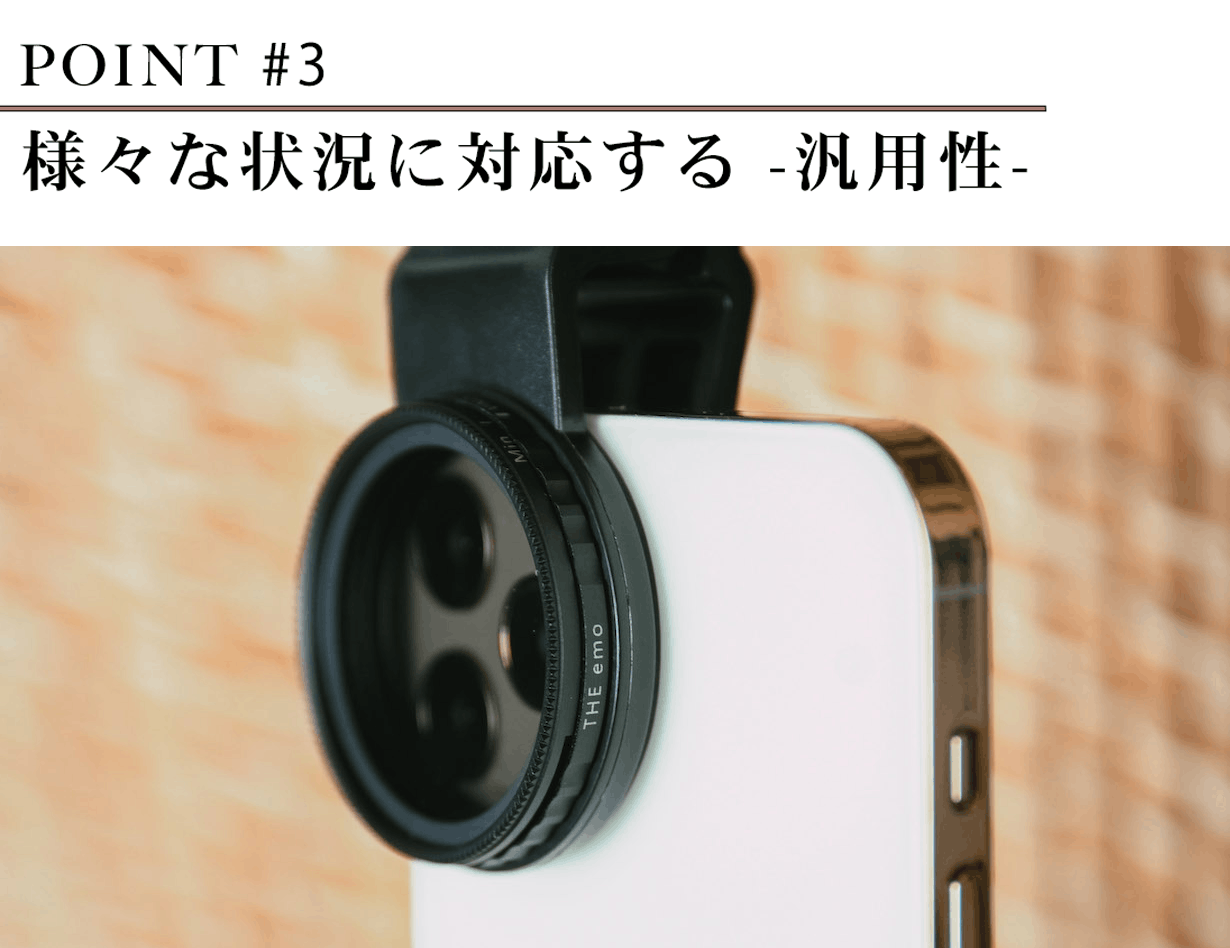 そんなプロの技の1つであるNDフィルターを、私たちが普段から使っているスマホカメラ用に開発したのが、今回ご紹介する【THE emo】のバリアブルNDフィルターです。