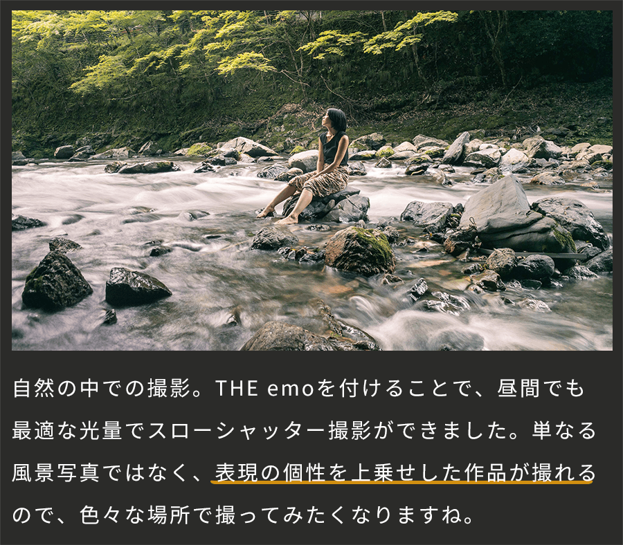 さらに、THE emoのフィルターは防水仕様。雨の日や水辺での撮影でも、撮影に集中できます。