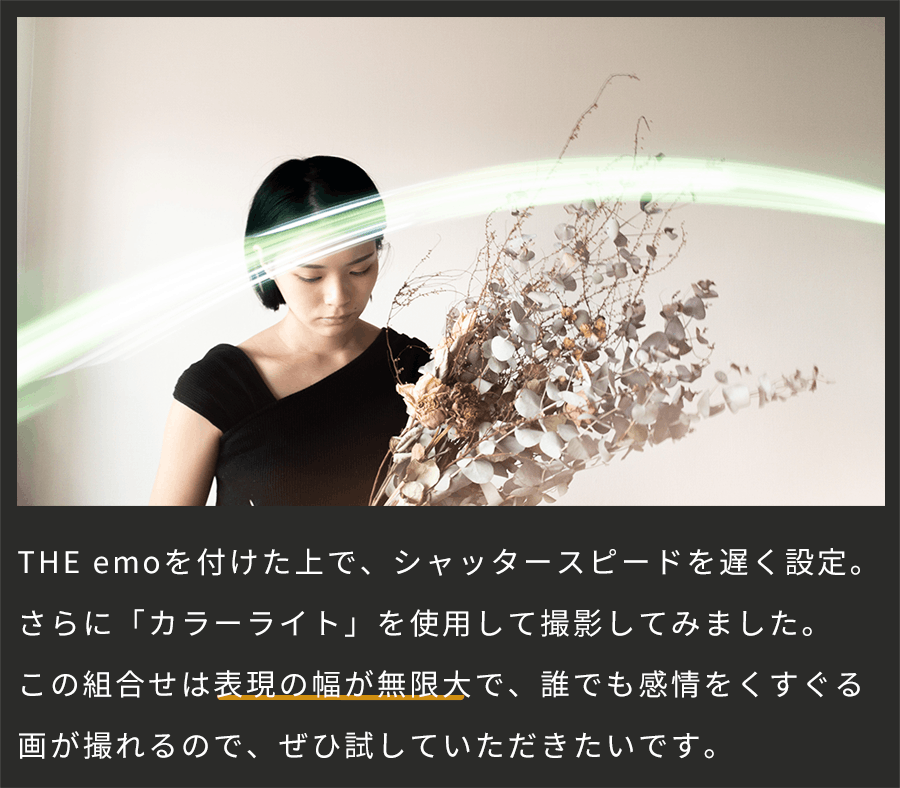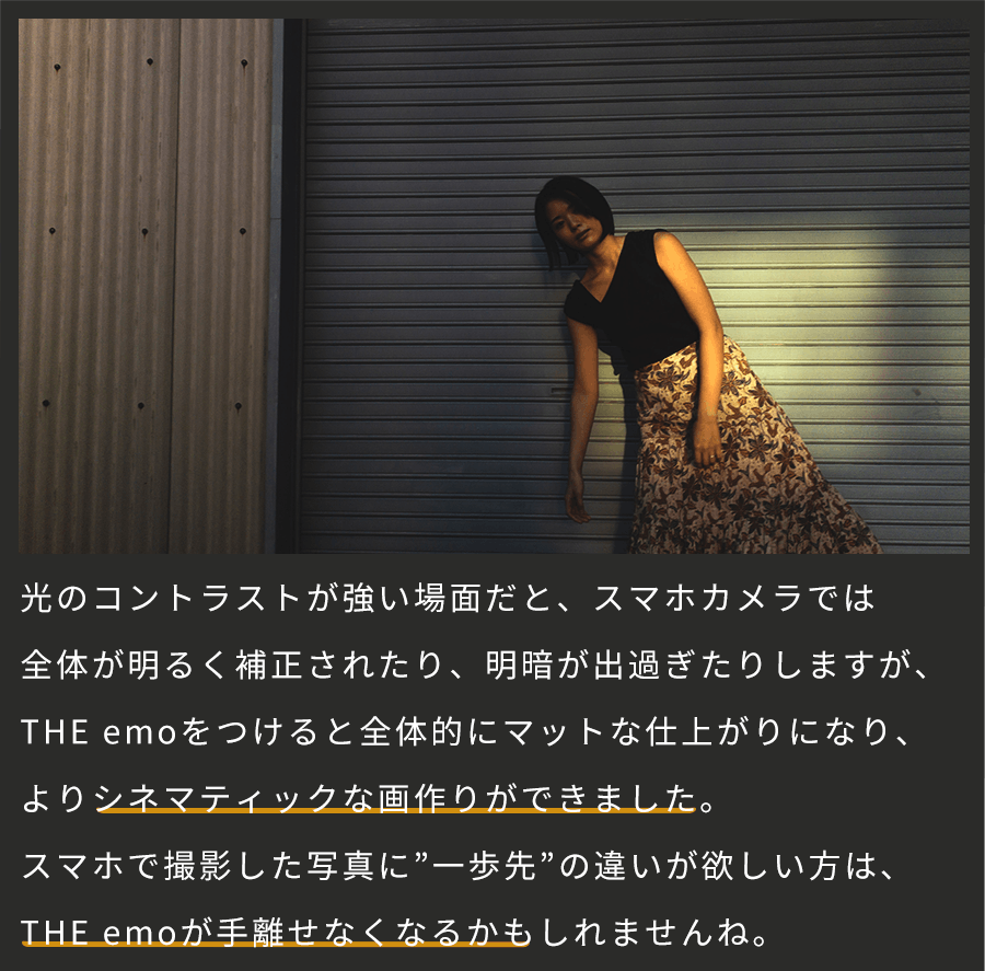 THE emoを使うことで、普段通りのスマホカメラでも、まるでプロが撮影したような表現幅が生まれ、ほかと差がつく作品を撮影できるようになります。