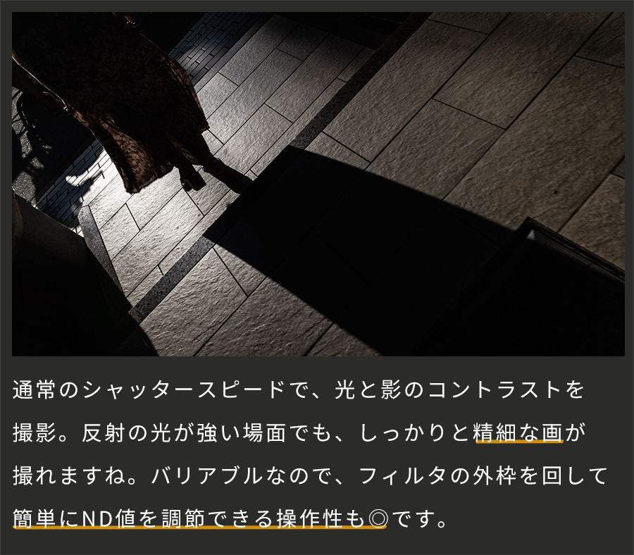 レンズの先端に装着することで、カメラに入る光の量を抑え、最適な明るさでのスローシャッター撮影や、光のさす場所で明暗のコントラストの効いた撮影が可能になります。