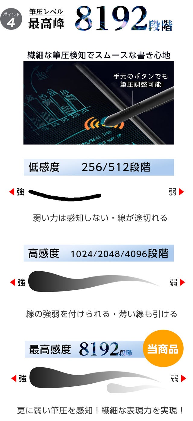 筆圧感知のレベルの高さは「より弱い電圧」に対して効果的。つまり、より繊細なタッチを描画することが可能となります。