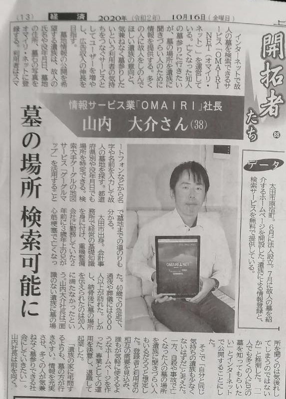 上毛新聞(群馬県)で❗️開拓者たち❗️で山内社長の【OMAIRI NET】が紹介されました。