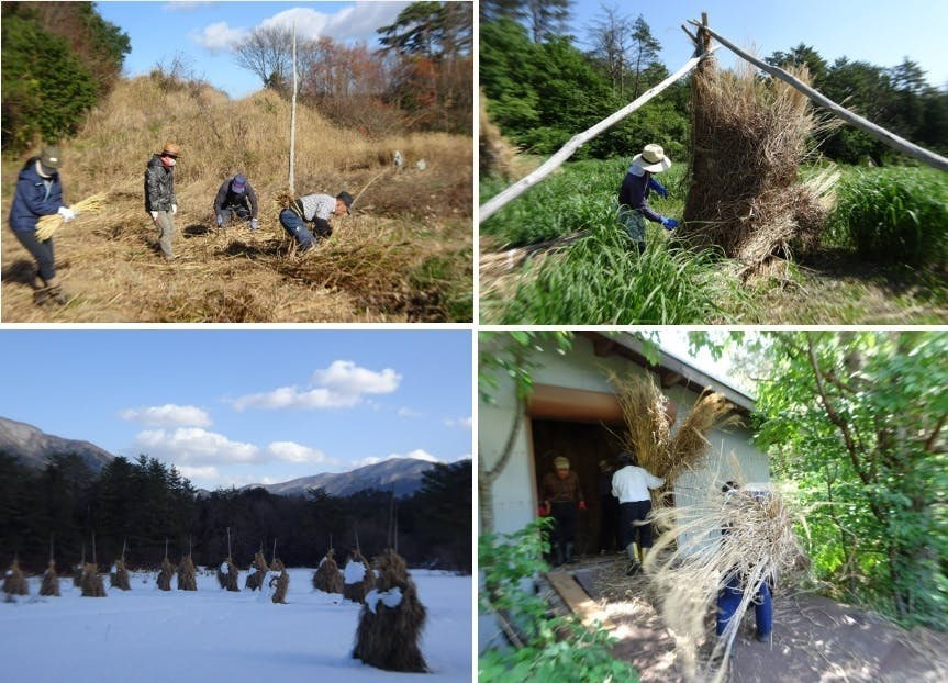 秋の収穫が終わると茅刈です。刈った茅はその場にグロにして乾かし、春に家に持ち帰り屋根裏に持ち上げ保存します。この作業を毎年繰り返し次回の葺き替えに備えてきました。