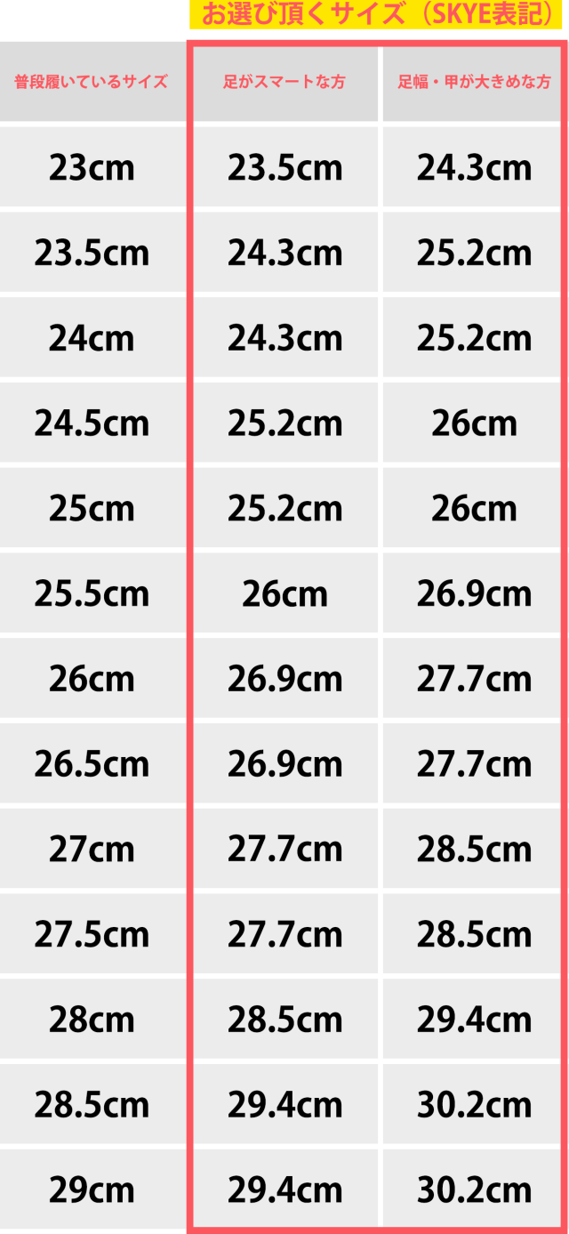 A1: サイズは「サイズ表」項目の日本の基準サイズであるcmをご確認下さい。The Mobrlyはカナダブランドのため、足幅がスマートな作りになっています。サイズをお選び頂く際は必ずサイズ表を参考にしてからご支援下さい。