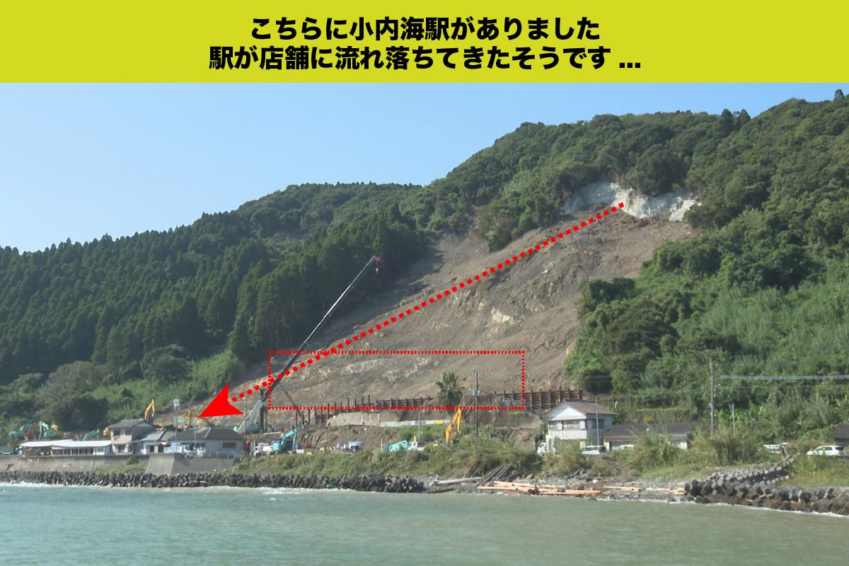 土砂災害の直前、山からの異音に気がつき、現オーナーが店舗に併設している自宅から逃げ出した直後、店舗の向かいの山にある「小内海駅」の上より土砂崩れが発生。