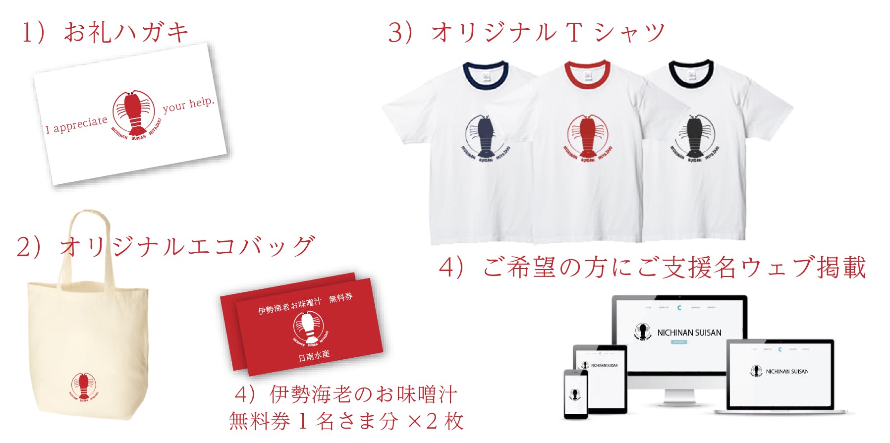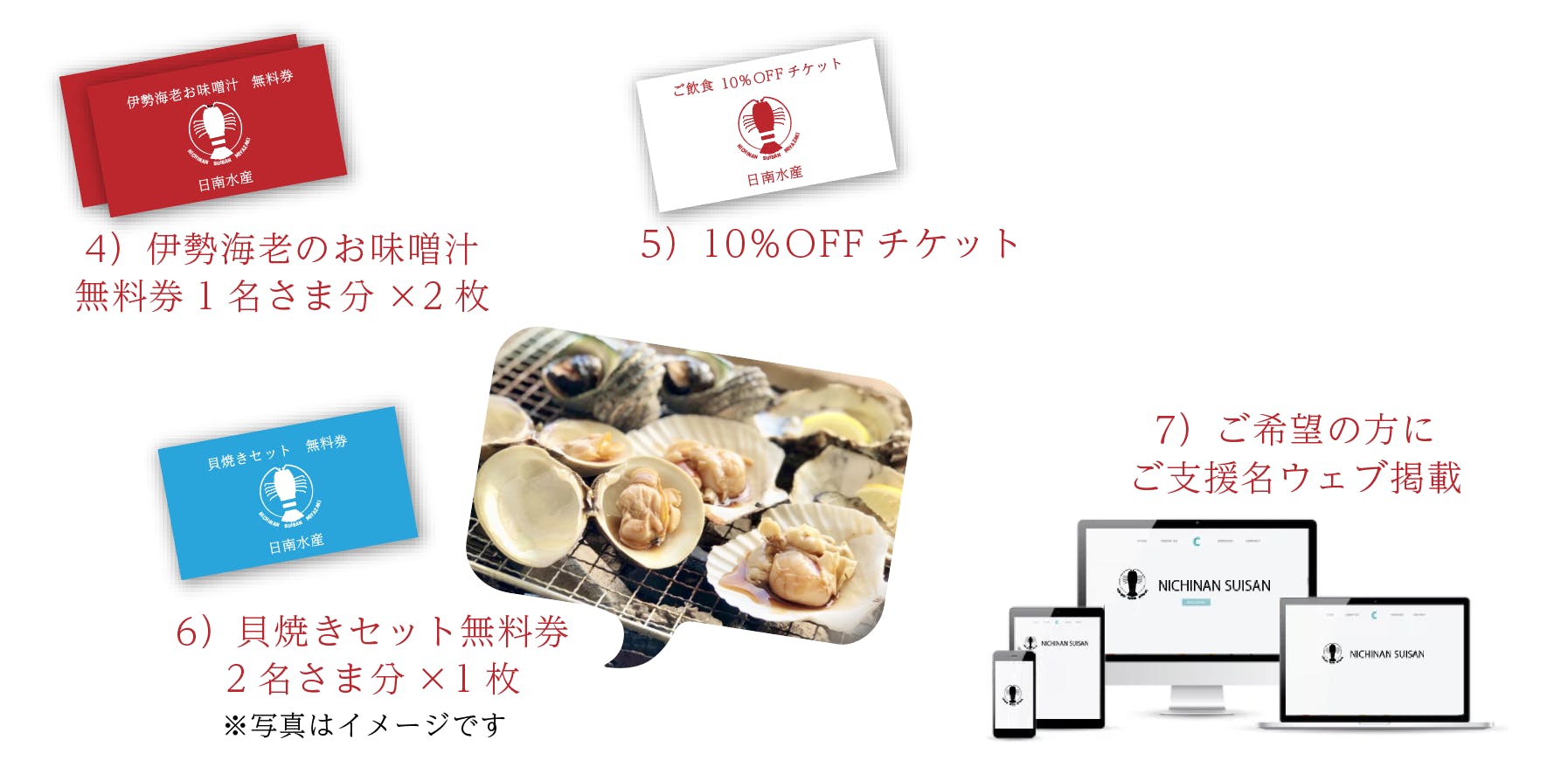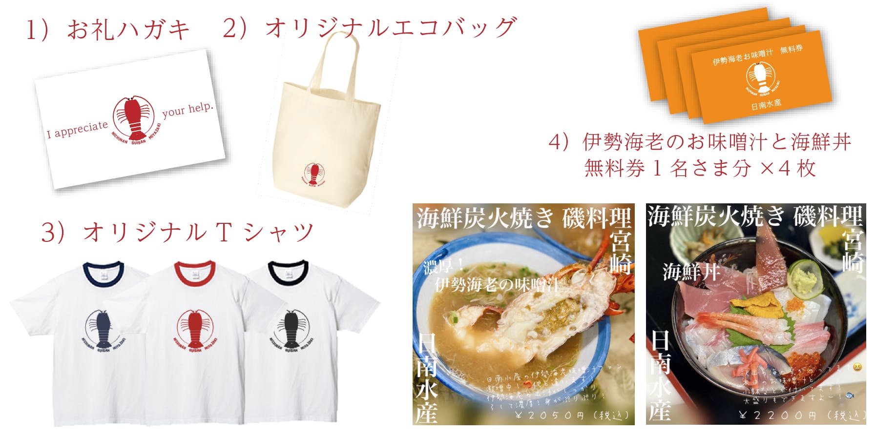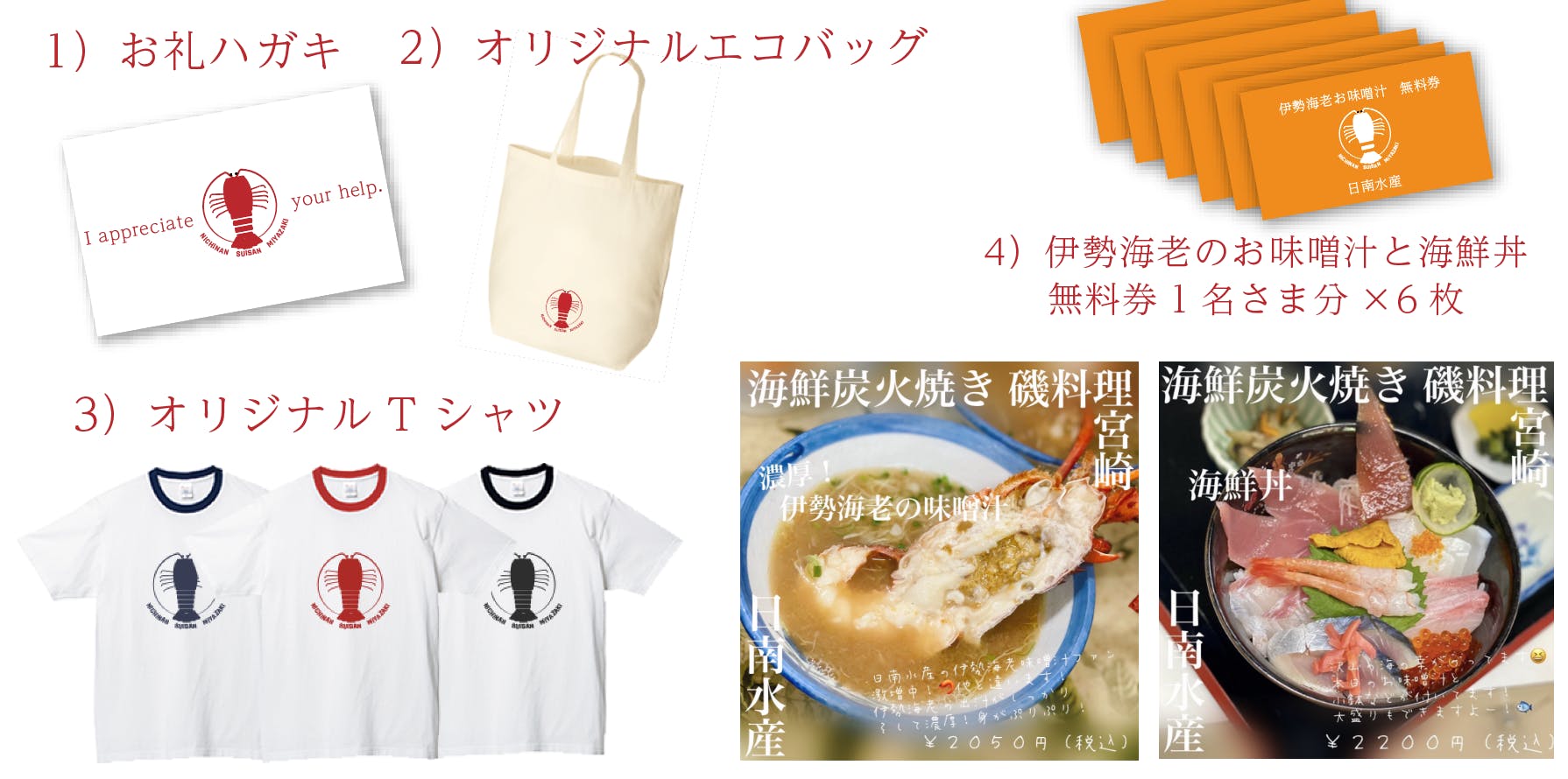 店舗再建の際にご利用いただけるお食事券や、スポンサー様ご紹介、再建になってからの配送になってしまいますが店舗名物の伊勢海老や貝類の詰め合わせなどを考えております。