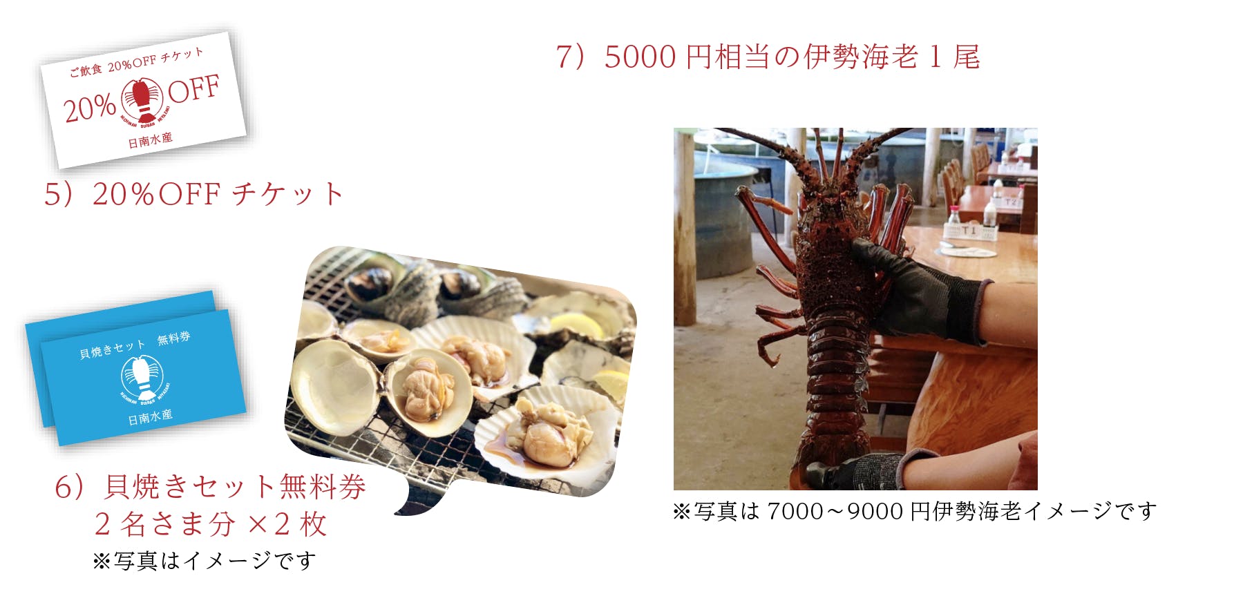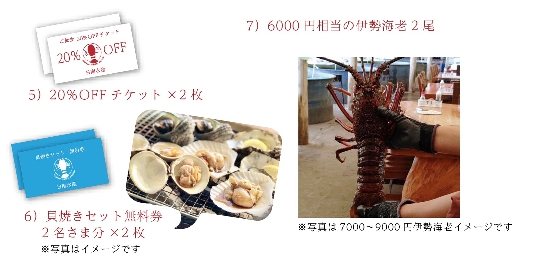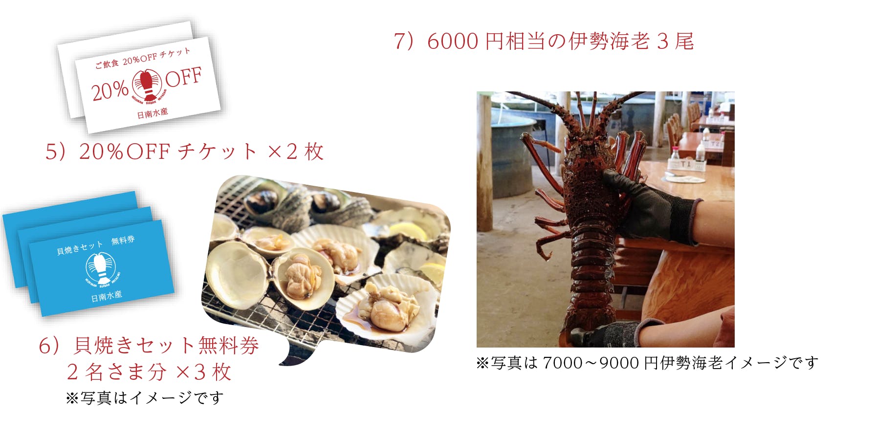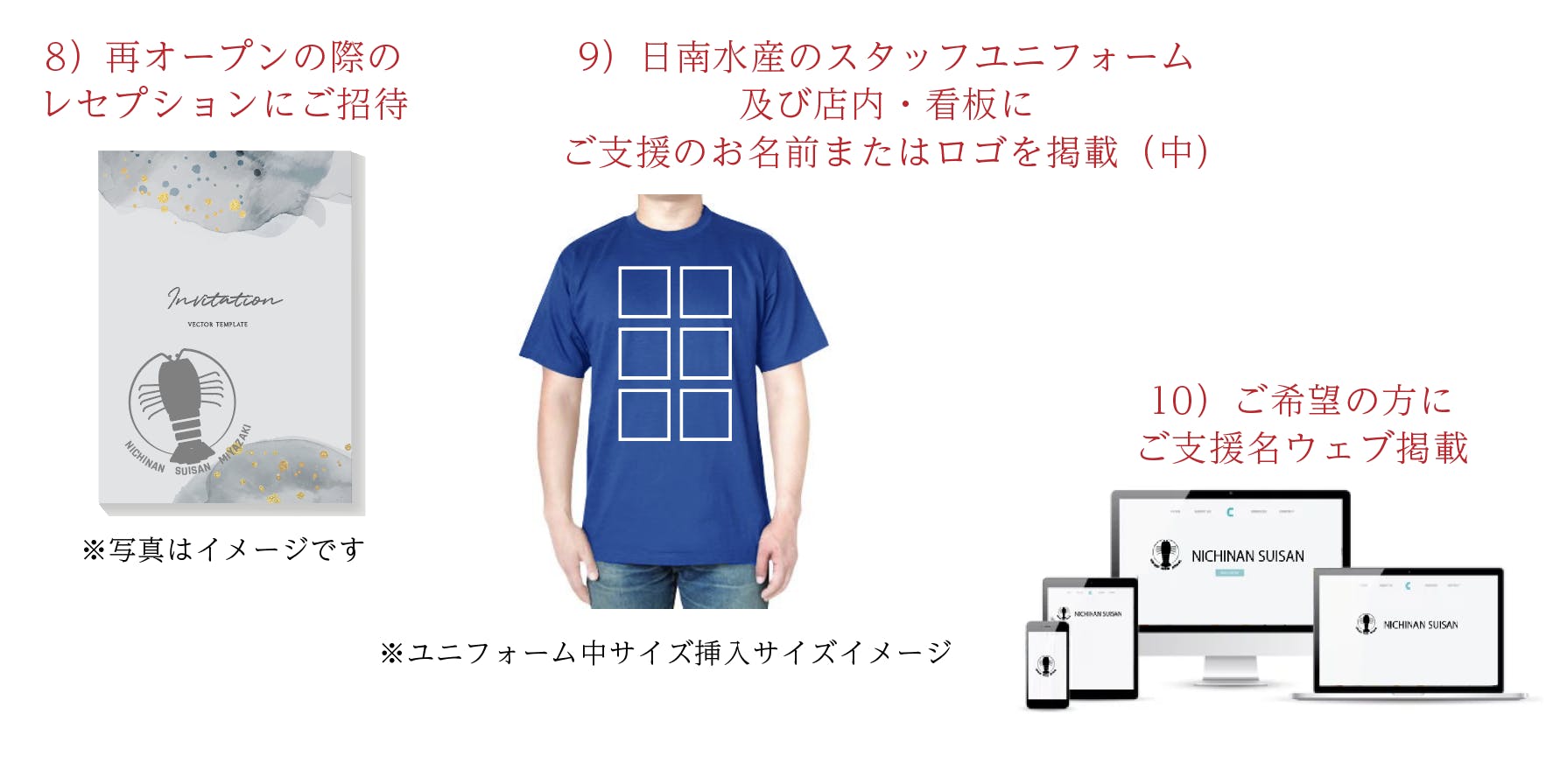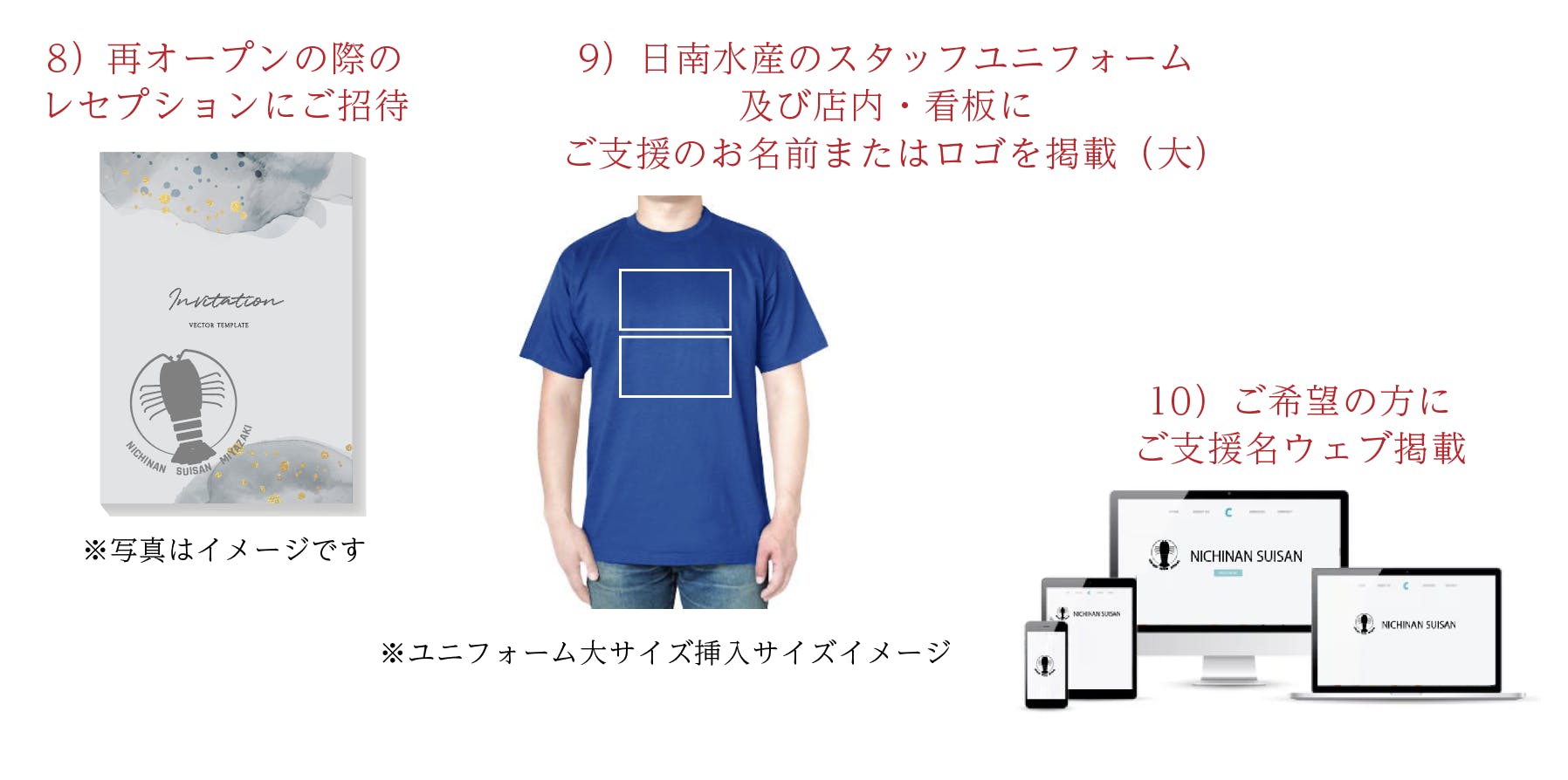 店舗再建の際にご利用いただけるお食事券や、スポンサー様ご紹介、再建になってからの配送になってしまいますが店舗名物の伊勢海老や貝類の詰め合わせなどを考えております。