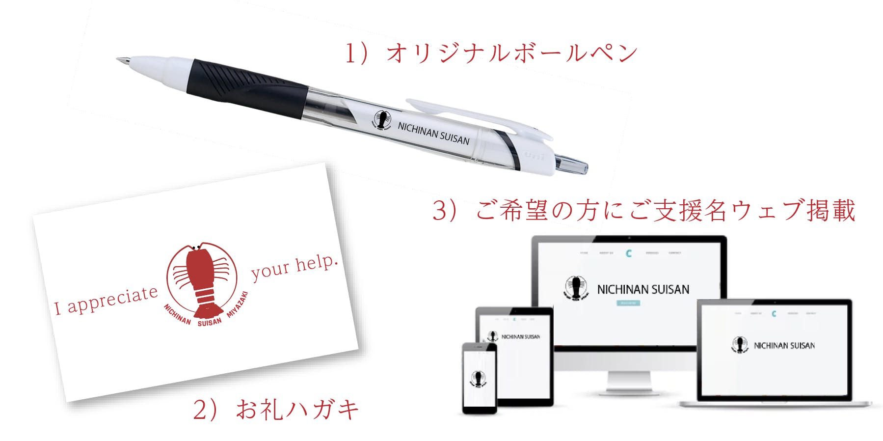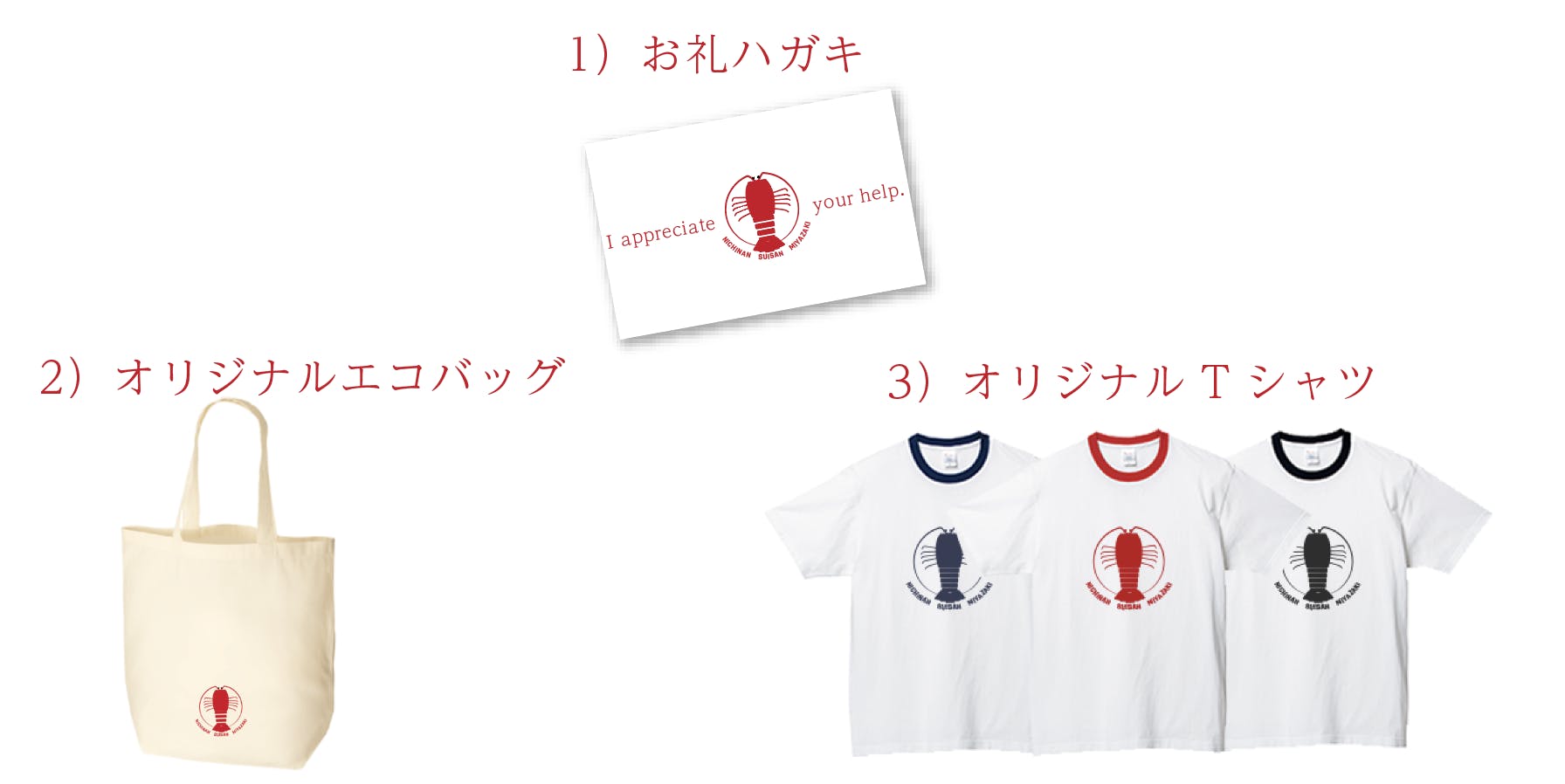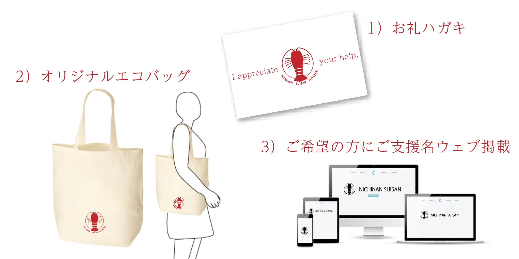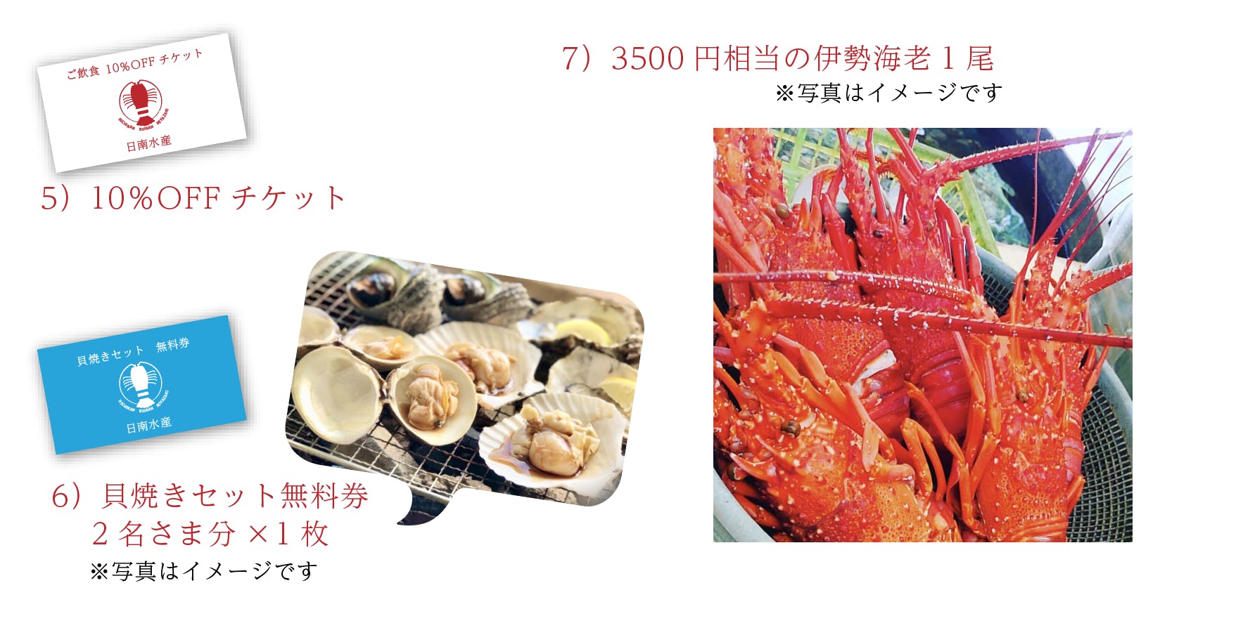 店舗再建の際にご利用いただけるお食事券や、スポンサー様ご紹介、再建になってからの配送になってしまいますが店舗名物の伊勢海老や貝類の詰め合わせなどを考えております。
