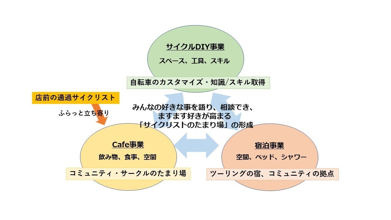 カフェと宿泊施設も併設することで、来て頂いた方には、青梅の地に足を運びゆっくりとした時間を過ごして頂くことができ、メンテナンス後の自転車で奥多摩サイクリングを楽しんで貰うことができると考えています。また、自転車を趣味とする人たちの「たまり場」を作っていきたいと思っています。