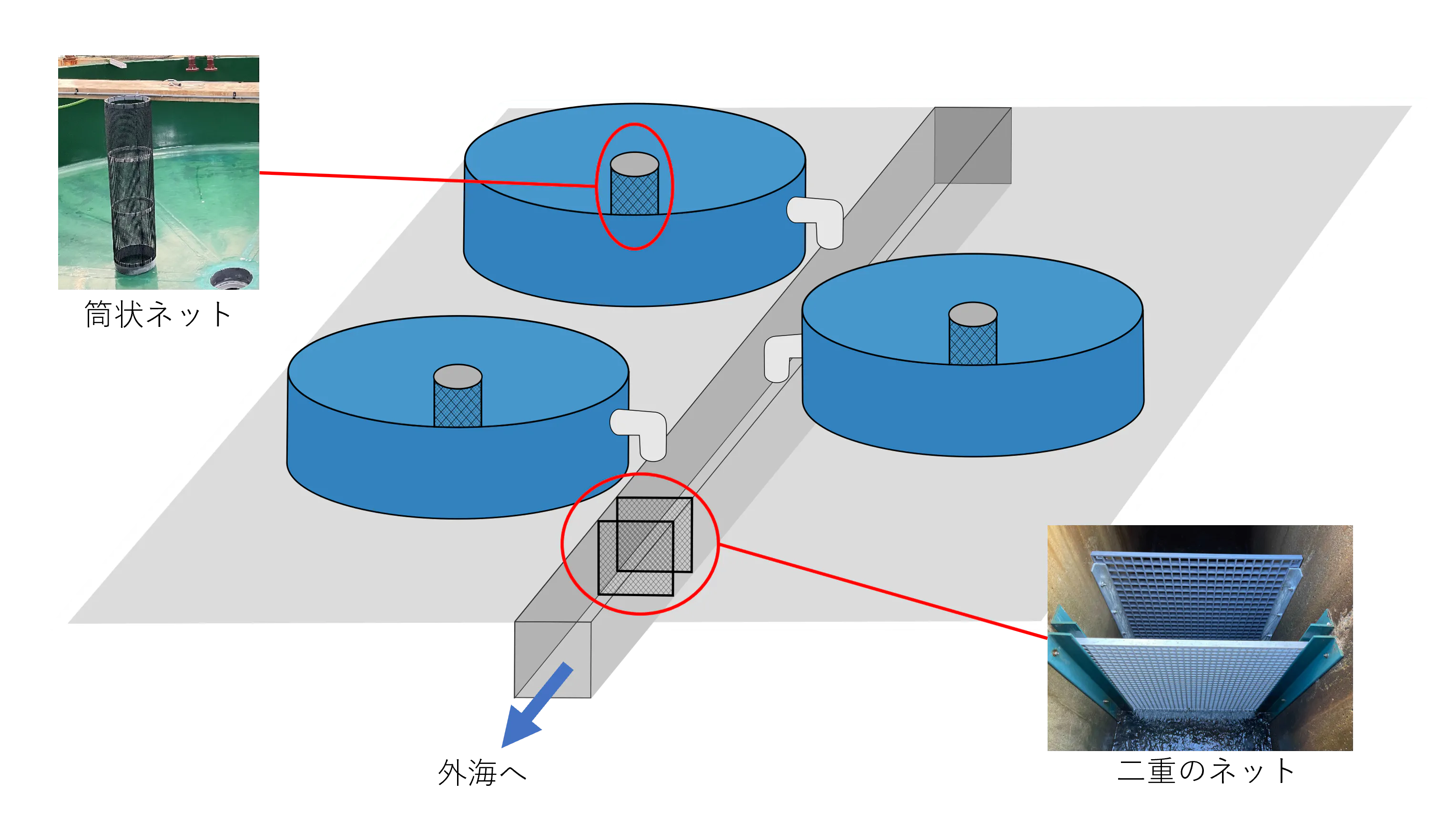 例えば、水槽内に筒状ネット、排水溝に二重のネットを設置することで、合計三重のネットを完備。魚の発育ステージに応じて目合いを変更すると共に、毎日こまめに掃除・点検を実施しています。