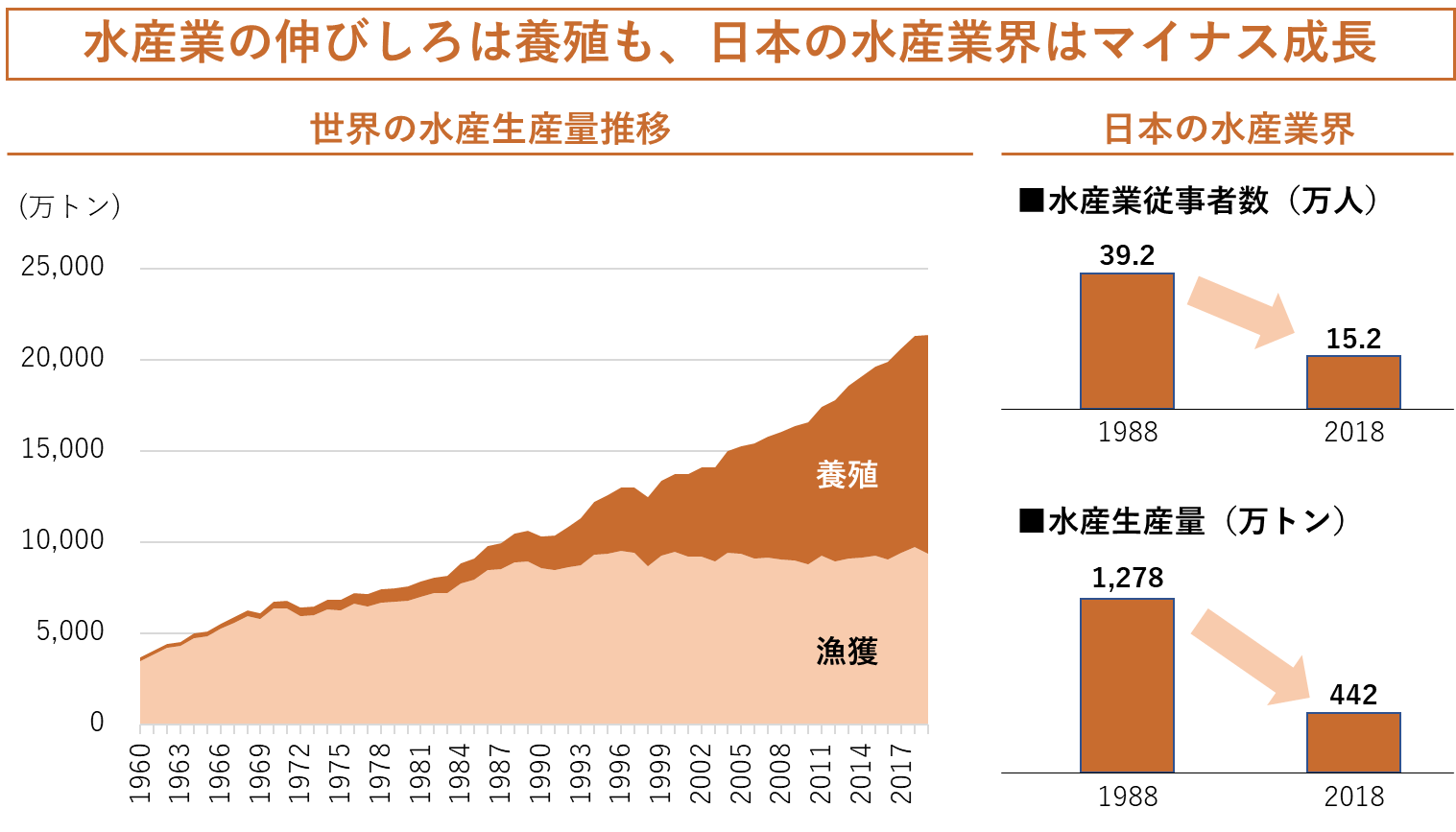 世界の水産生産量は大きく伸びていますが、乱獲・気候変動といった要因によって水産資源の保全が重要となっており、この30年間、漁獲量はほとんど増えていません。つまり水産業界の伸びしろは、天然物の漁獲ではなく、養殖にあります。