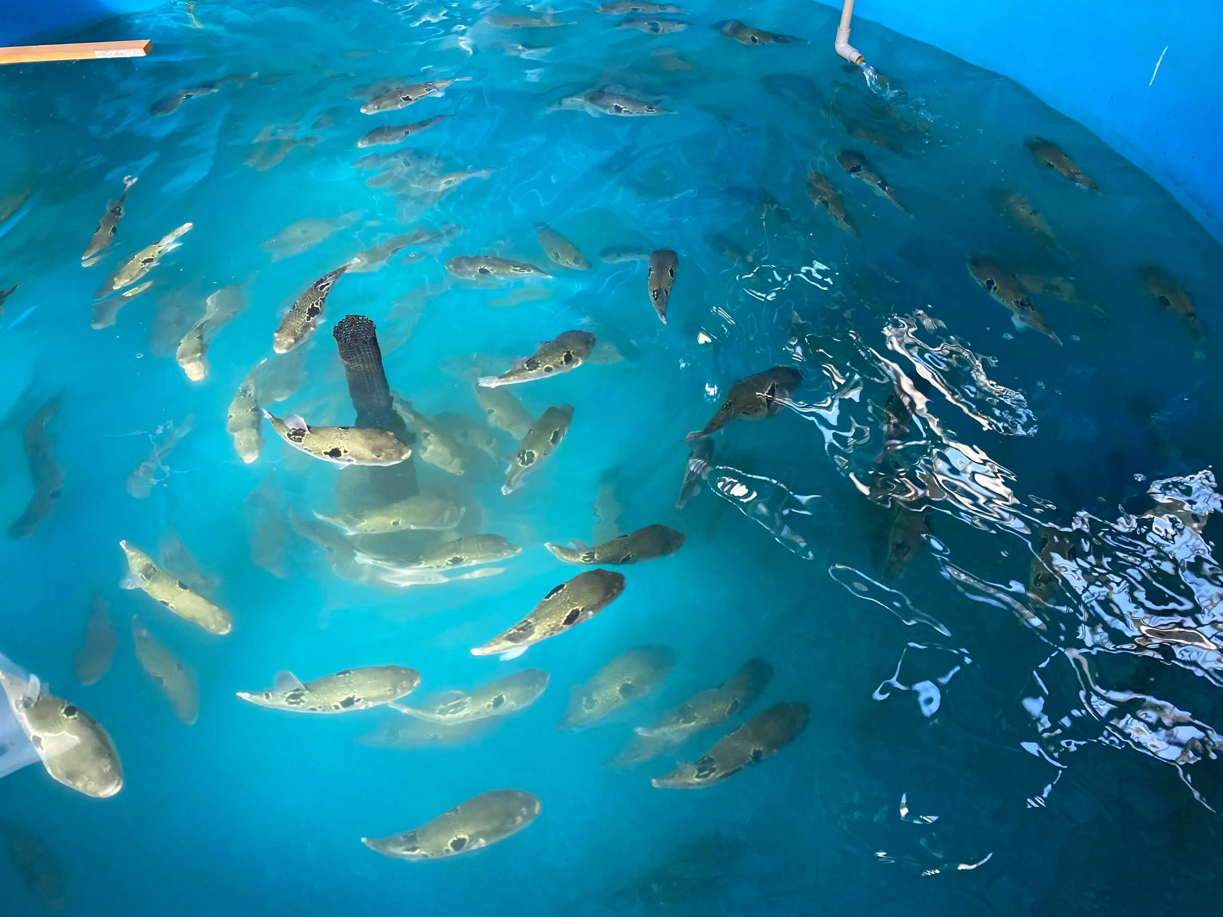 ゲノム編集技術を用いるため、魚が外海に逃げ出さないよう、飼育水槽は陸上養殖施設に設置し、様々な拡散防止措置を執っています。