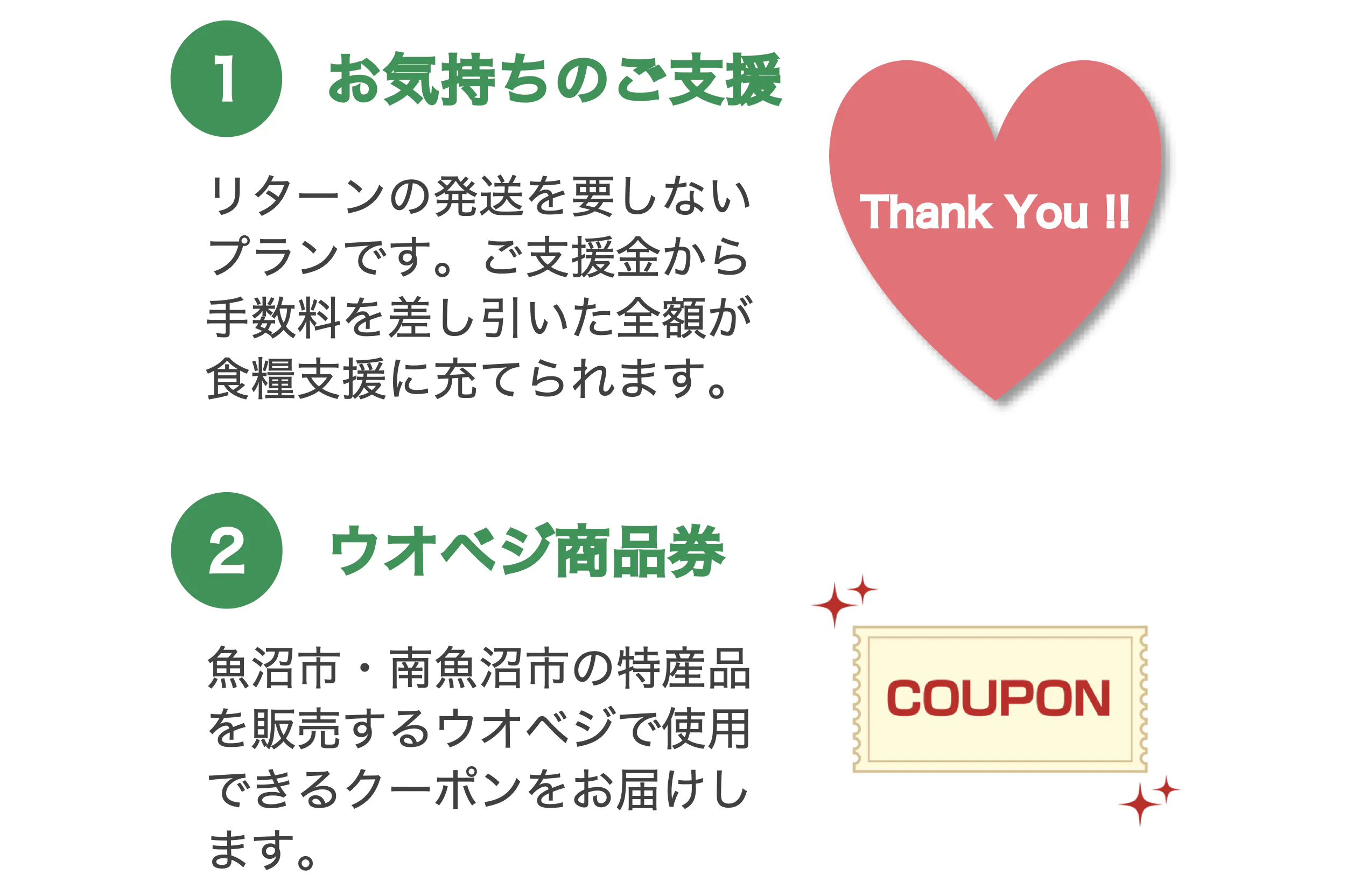 それぞれ、お支払いいただくご支援金額に応じて内容が異なります。