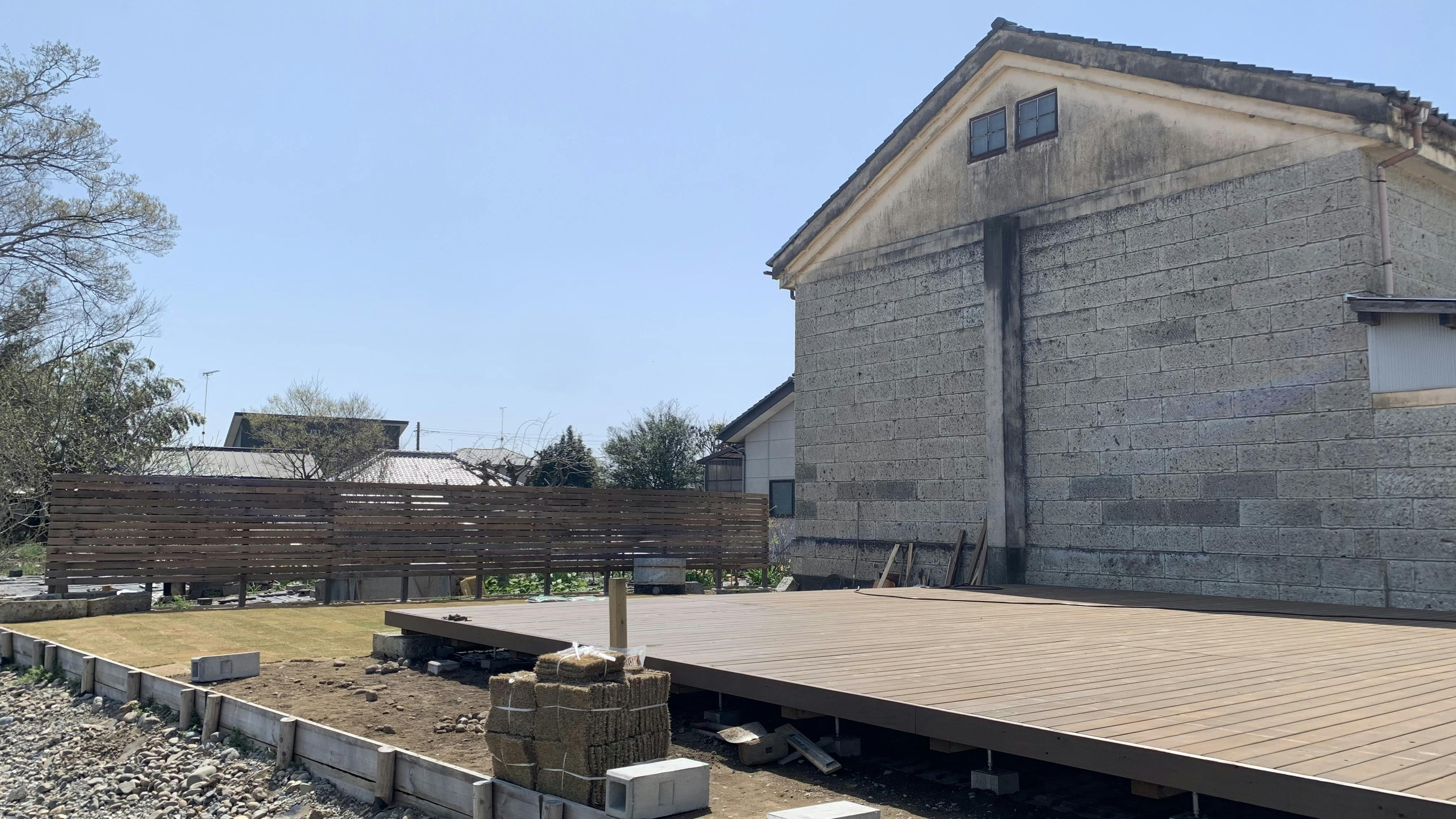 ◆ウッドデッキを元々ある倉庫の基礎部分も利用して作ります。あるものを最大限に活用が吉田村のモットー!
