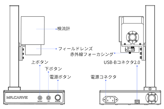 精度面を考慮してMR.CARVEのピントの合わせ方は手動式にデザインされています。機器本体の「上ボタン」「下ボタン」で赤い点を移動し、2つの赤い点が重なり合えば焦点合わせが完了します。