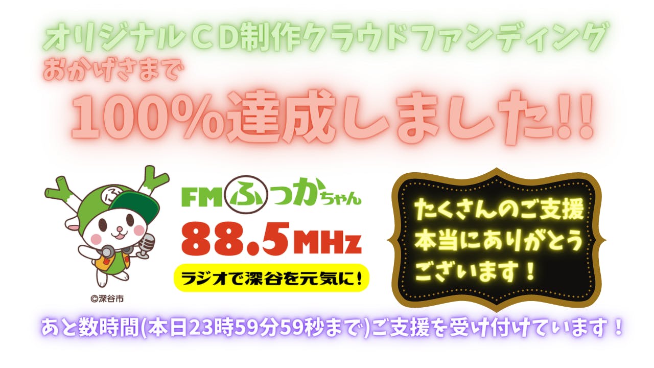 そこで、FMふっかちゃんで活躍する4人の生放送パーソナリティを中心に、オリジナルソングCDの制作を行い、皆さんの力を借りて、元気を届けようと考えました。