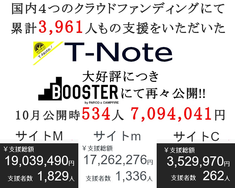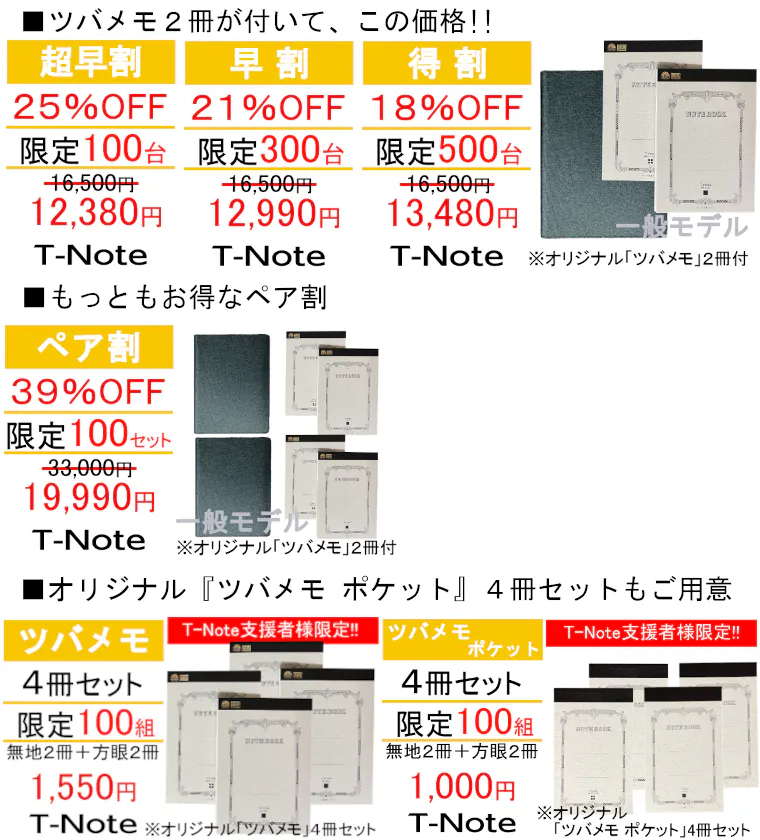 2024/01/27 12:00お世話になります。MKトレードです。■ライフハッカーで紹介されました!タブレットやスマホで手書きデータを管理できるようになりましたが、「やっぱり紙とペンで記録したい!」そんなワガママを叶えてくれるガジェット文具として『T-Note2』を紹介していただきました♪是非商品レビューを参考にご購入をご検討ください。掲載記事はコチラhttps://www.lifehacker.jp/article/machi-ya-tnote2-end-719281/画期的なタブレット!『T-Note2』おかげさまで200人達成!大変多くの方にご支援いただき心より感謝申し上げます。https://camp-fire.jp/projects/view/719281今回のプロジェクト『T-Note2』をご支援いただいたリピーター様に対して「先着50名様 オリジナルポケットメモ帳プレゼント」を開催中!※リピーター様、事前登録いただいた支援者様限定のキャンペーンです。 先着50名様まだご応募可能です!是非ご応募ください!---------------------------------------------------★応募方法★今回のプロジェクト『T-Note2』をご支援のうえ、「メッセージを送る」より下記を記載してご応募ください。【リピーター様】 ・過去にご支援くださった弊社プロジェクトの商品名 ・過去支援ID ・氏名【事前登録者様】 ・事前登録メアドまたはLINE名称 ・『T-Note2』の支援ID最後まで、どうぞよろしくお願いいたします。https://camp-fire.jp/projects/view/719281『T-Note2』プロジェクトスタッフ一同************************************************************追加購入などに便利な「MKTrade限定公開ショップ」もぜひご覧ください♪https://mktrade2.official.ec/ もっと見る