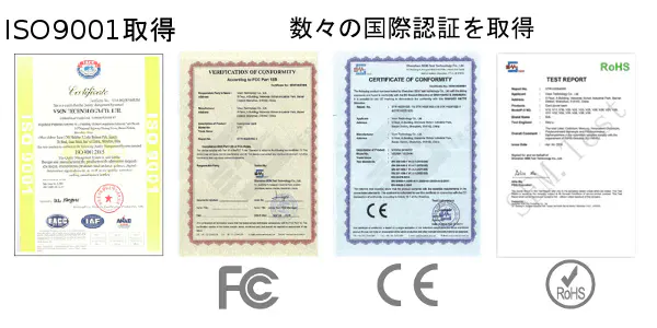 会社の急速な発展に伴い、常に管理レベルの向上につとめ品質マネジメントシステムISO9001も取得しています。各製品はCE、FCC、FDAなどによって国際的安全基準をクリアしています。