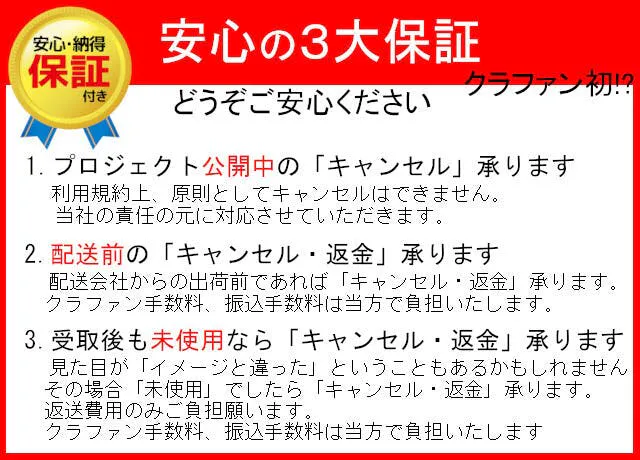●キャンセル・返品: 当プロジェクトは「All-in型」の為、お申込み完了をもって契約が成立いたします。その為、「イメージと違った」等のお客様都合による返品・キャンセルは基本的にはできませんのでご注意ください。尚、製品到着後に破損や初期不良がある場合には交換させていただきますので「メッセージで意見や問い合わせを送る」から、または説明書記載の連絡先までお問い合わせください。