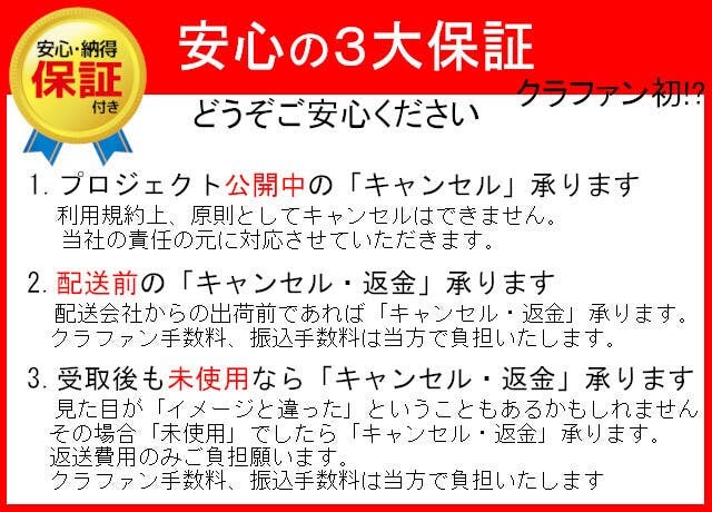 ●キャンセル・返品: 当プロジェクトは「All-in型」の為、お申込み完了をもって契約が成立いたします。その為、「イメージと違った」等のお客様都合による返品・キャンセルは基本的にはできませんのでご注意ください。尚、製品到着後に破損や初期不良がある場合には交換させていただきますので「メッセージで意見や問い合わせを送る」から、または説明書記載の連絡先までお問い合わせください。