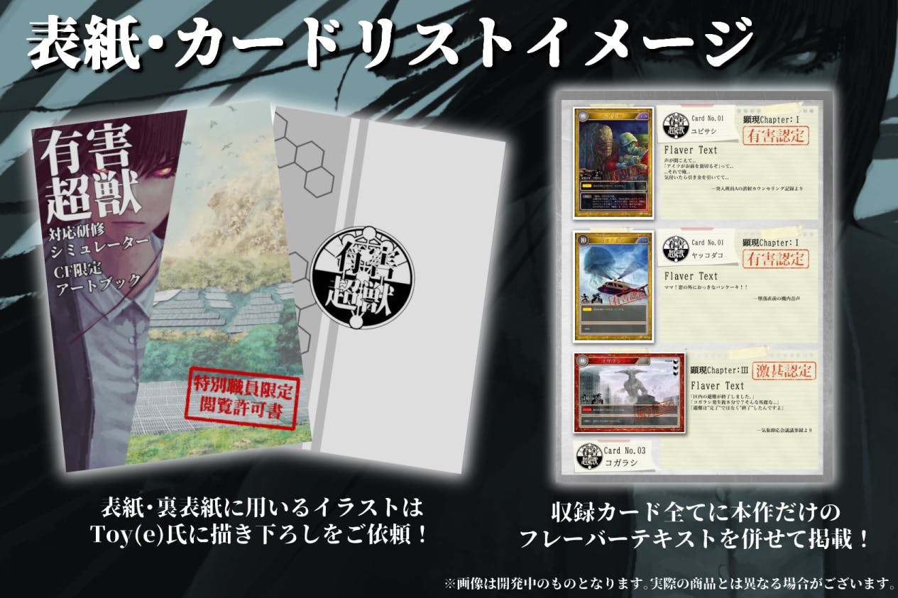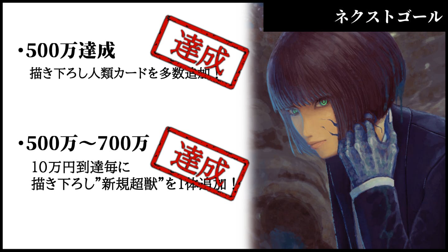 500万達成により人類側のカードを多数描き下ろしていただき、それ以降は10万円達成毎にまだ見ぬ新たな超獣を1体ずつ追加いたします。もちろん新規の超獣はToy(e)氏の描き下ろしとなります。