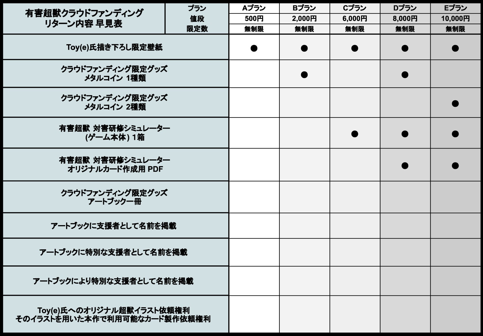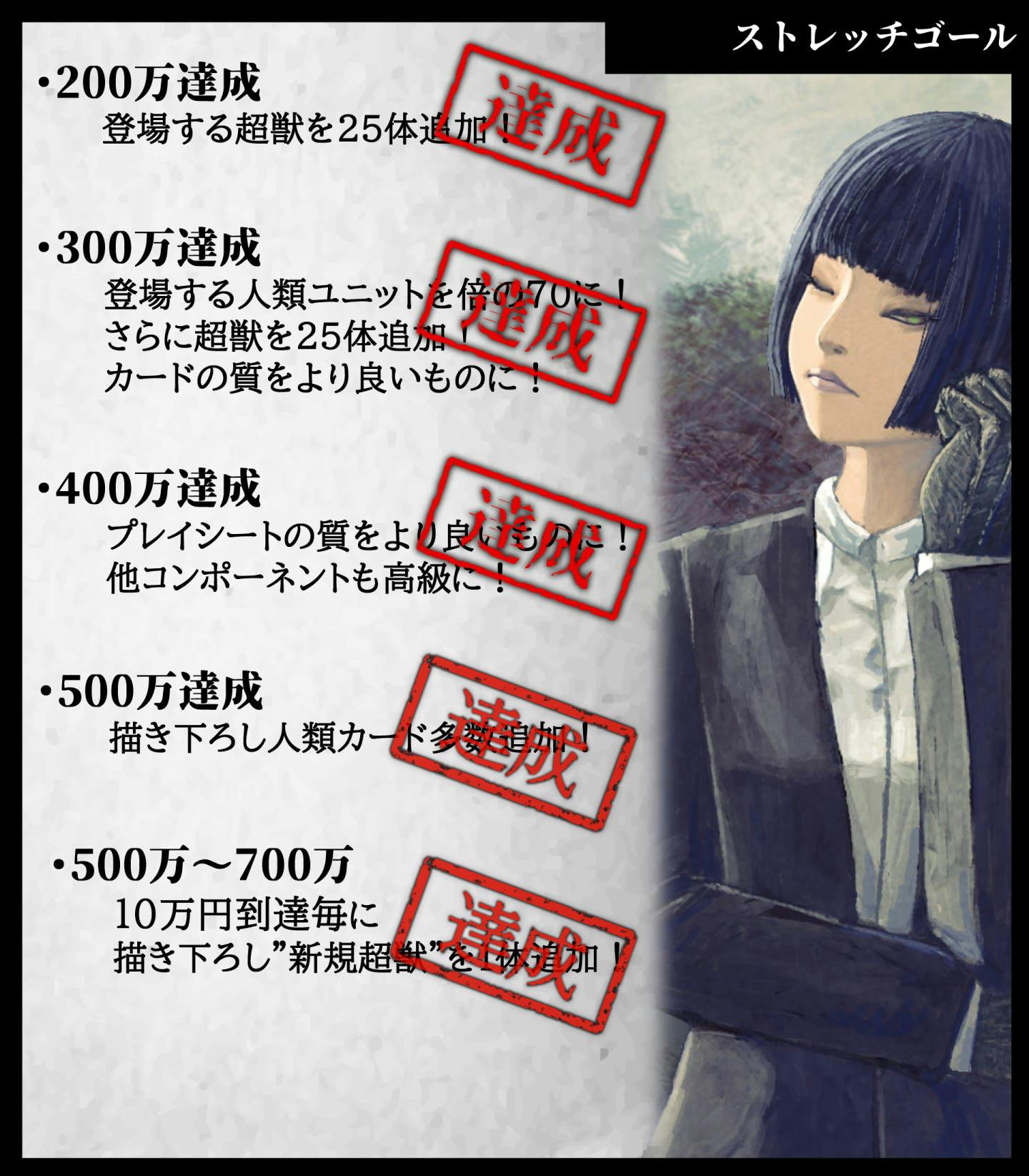 500万達成により人類側のカードを多数描き下ろしていただき、それ以降は10万円達成毎にまだ見ぬ新たな超獣を1体ずつ追加いたします。もちろん新規の超獣はToy(e)氏の描き下ろしになります。
