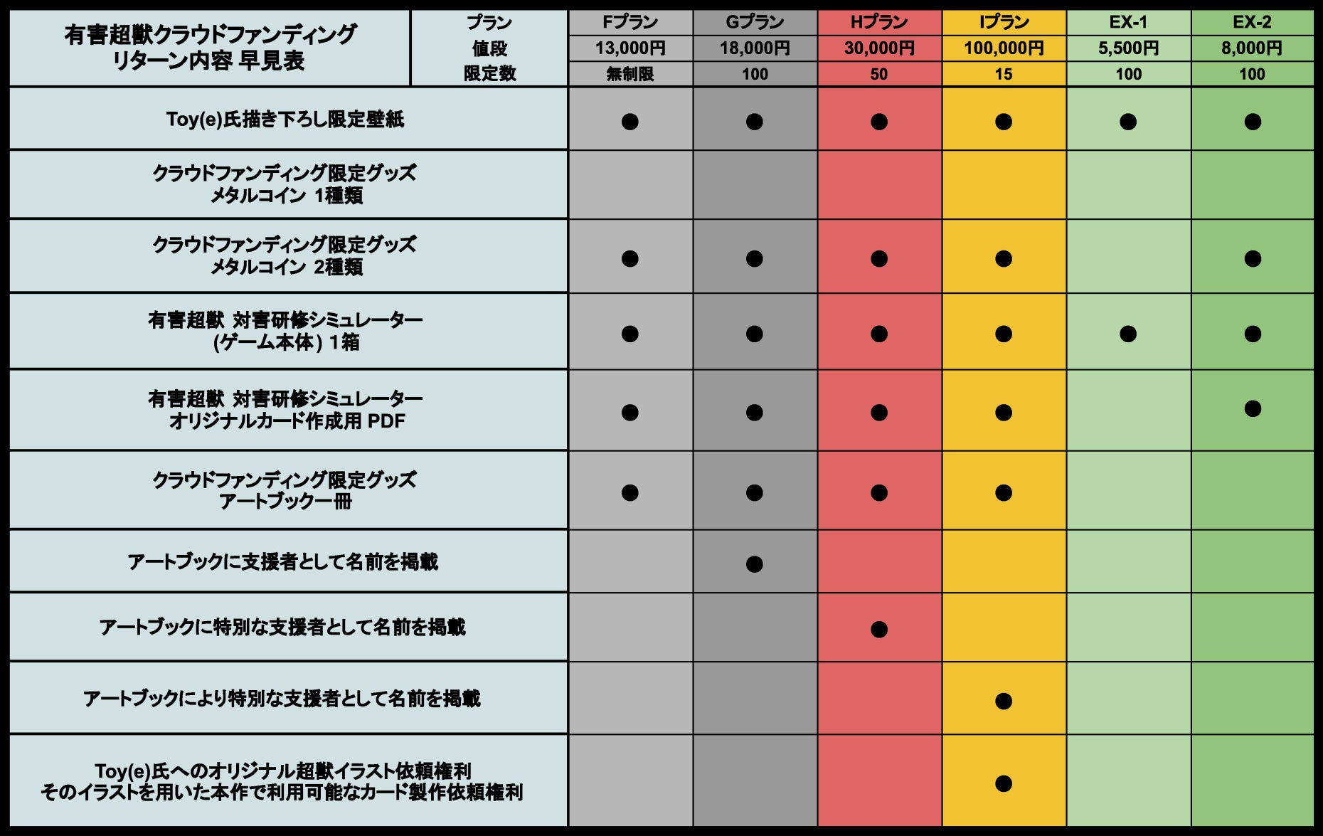 本製品の製造費に加え、クラウドファンディング手数料の支払い他、原作者であるToy(e)氏へのイラスト利用料やIP利用料に充てさせていただく予定です。支援金額)が大きくなるほどゲームサイズが拡張され、それに伴ってToy(e)氏への新規イラストの発注等が行えるようになります。