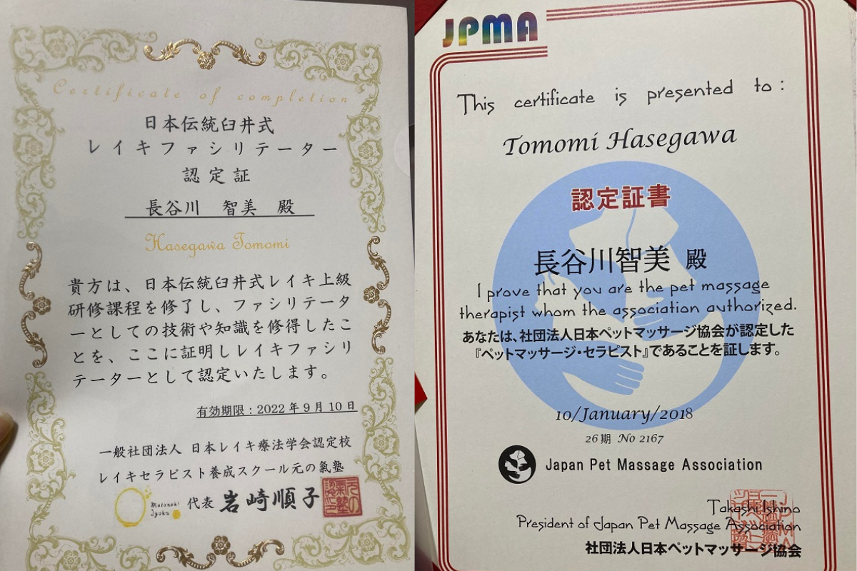 これまでの経験を活かし、世の中のペットたちやその飼い主さんに対して何か自分ができることはないかと考え、レイキファシリテーターとペットマッサージ・セラピストの資格を取ることにしました。
