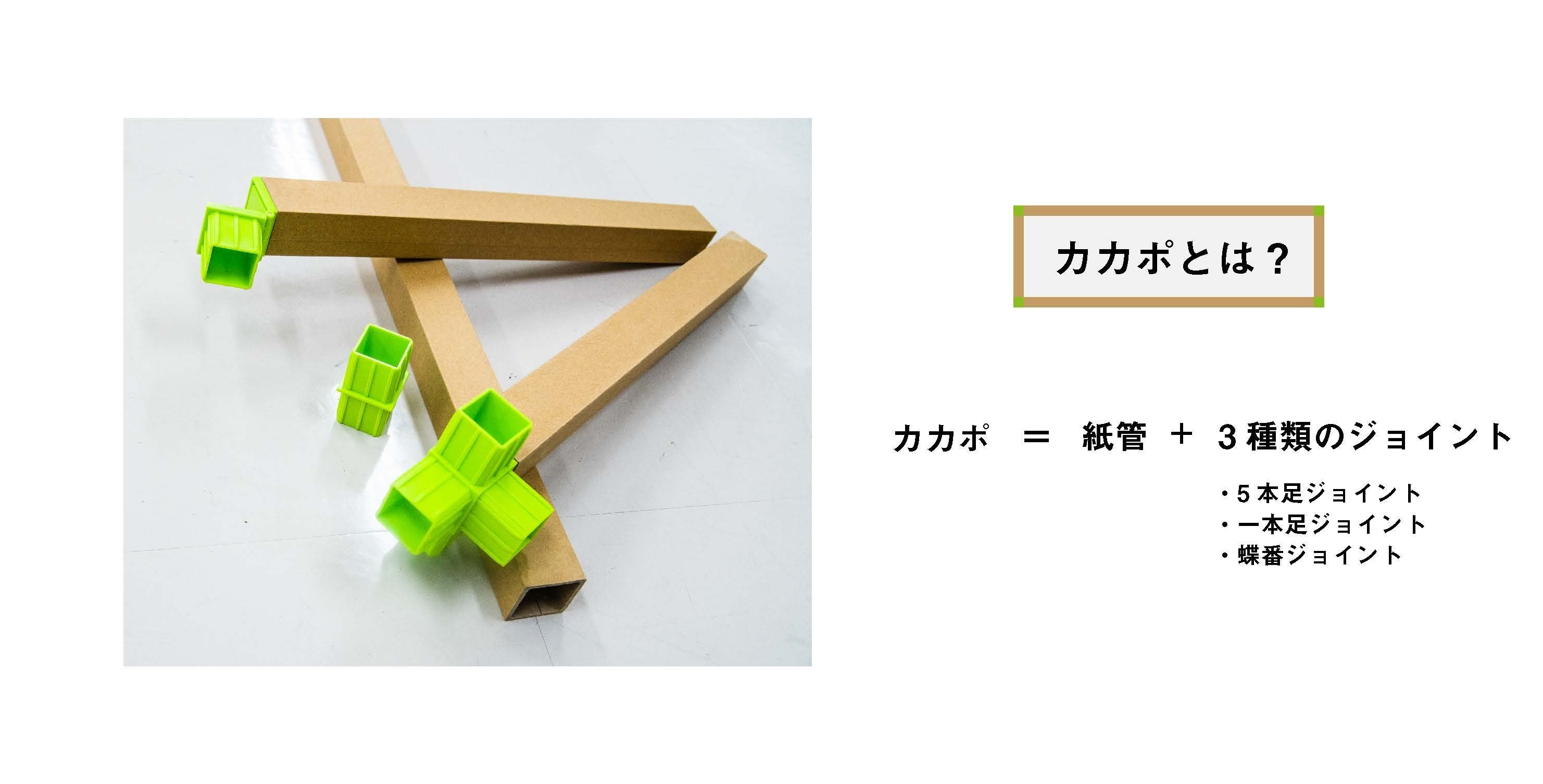 カカポは、紙管とジョイントを組み合わせて建築的な空間を作るシステムです。紙管は紙を圧縮したもので軽くて丈夫、ジョイントはオリジナルで開発した3種類。この紙管とジョイントを組み合わせて、人が入ることのできる大きな構造物を、簡単に作ることができるのです。生活の変化によって、解体や作り直しもラクラク!加えて、繰り返し長く使えます。
