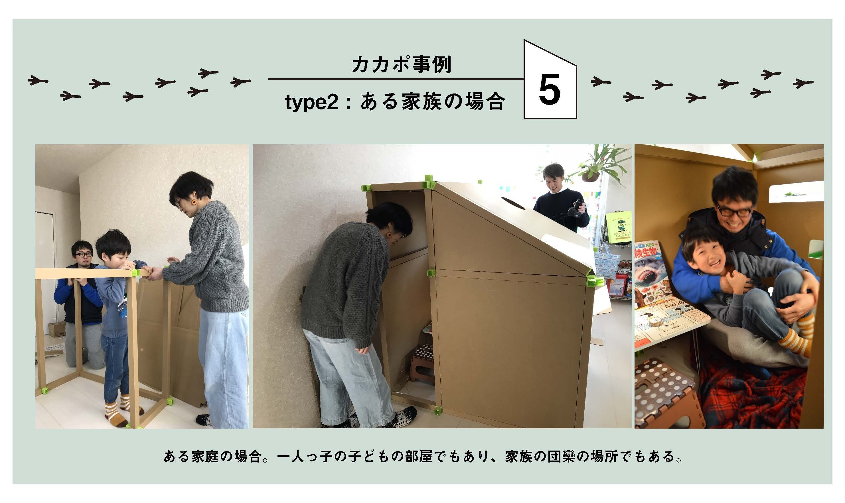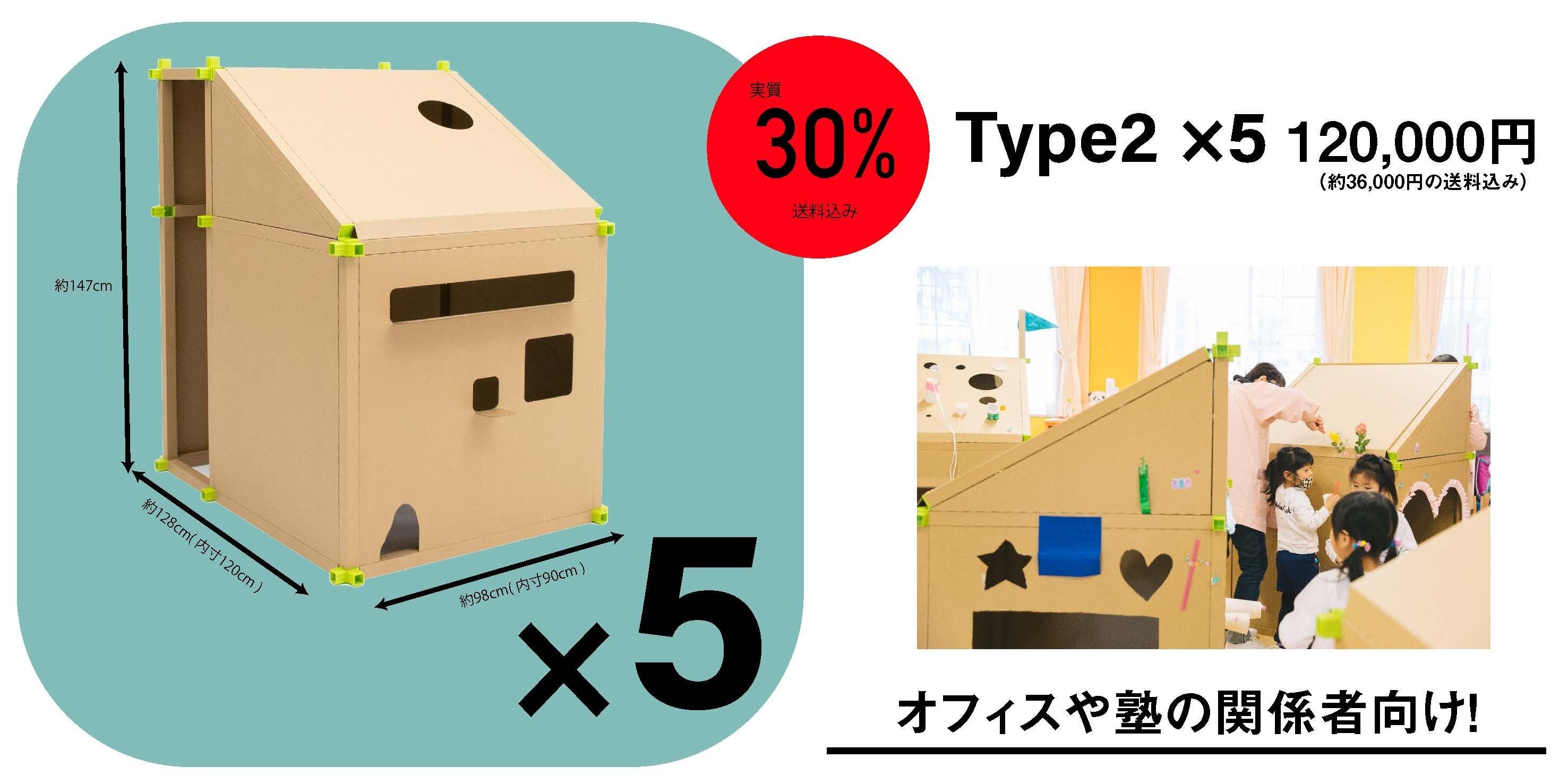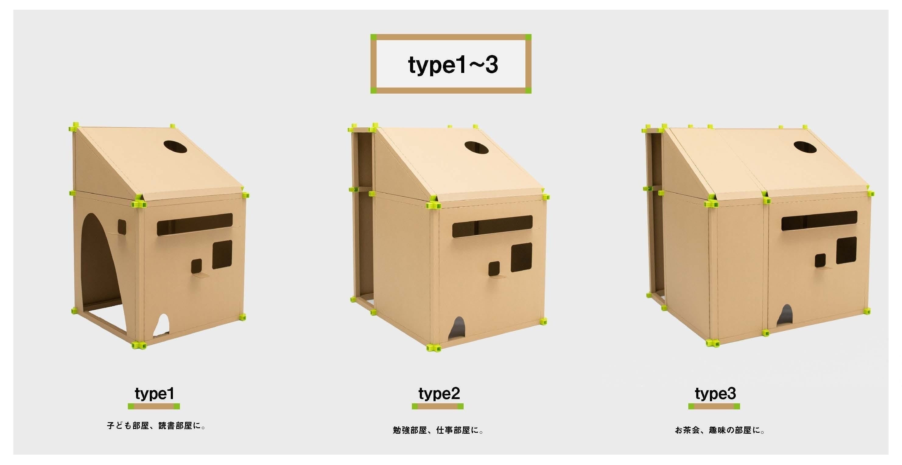 Type1~3は、紙管とジョイントで丈夫な骨組みを作り、そこにダンボールパネルの壁をはめ込んで作る、家型キットです。