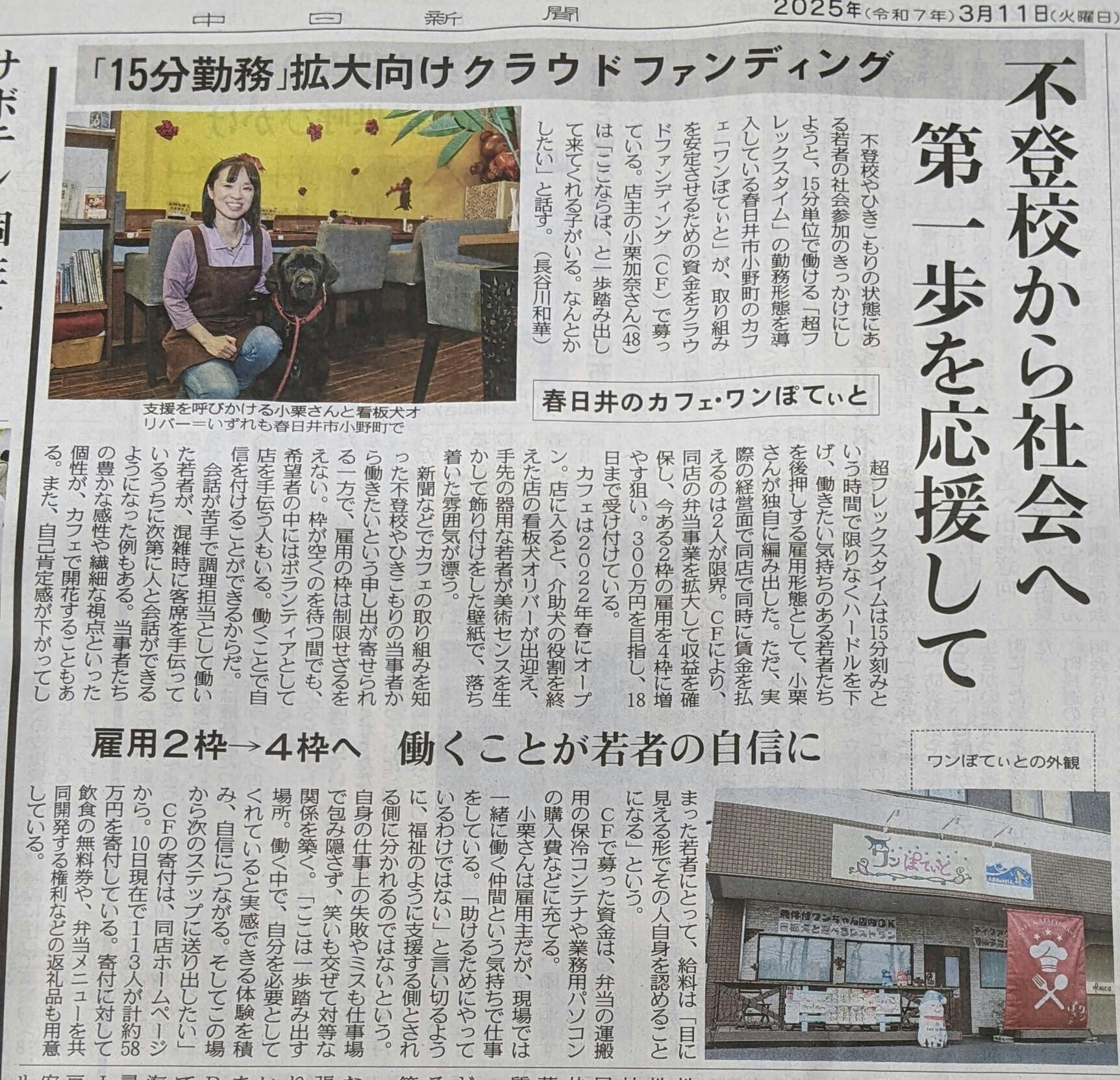 2025/03/12 07:003月11日、中日新聞に、掲載して頂きました!2022年、キャンプファイヤーでのご支援、ありがとうございました。ワンぽてぃとはまもなく3年を迎えようとしています。補助金等を貰わず普通のカフェレストランとして営しております!ずっと続けたい!そんな気持ちはありますが、昨今の物価の高騰に大きな影響を受け、お店は厳しい状況です。今、クラウドファンディングをコングランドで挑戦しております。手数料の関係で、サイトを変更致しました。https://congrant.com/project/wanpoteito/14778こちらは毎月寄付のページです。https://congrant.com/project/wanpoteito/14174500円から毎月寄付が可能です。3月18日までです。応援宜しくお願い致します!ワンぽてぃとが特別ではなく、普通の社会にしたいです!お店ではお米やお野菜などの寄付も募っております。お願い事ばかりで恐縮です。お近くにお越しの際は、お立ち寄り頂けますと大変嬉しく思います。今日も、良1日でありますように。 もっと見るとまり木新聞をお送りさせて頂きます。