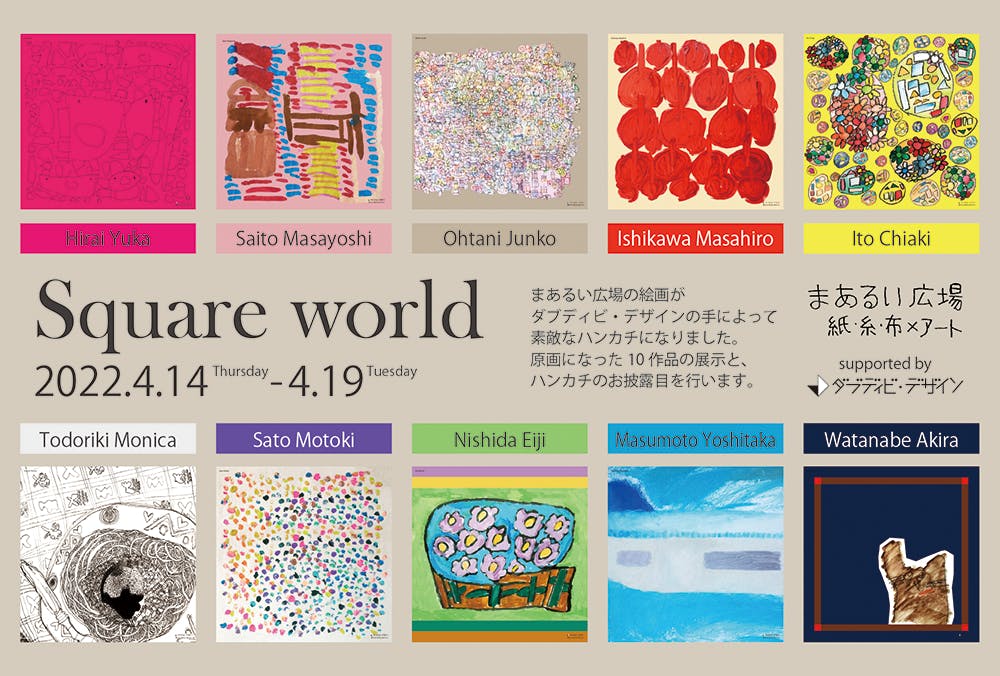 2022/04/13 10:00みなさん、おはようございます。ダブディビ・デザインの柊伸江です。ダブディビ・デザインの初クラウドファンディング、【毎日が楽しくなるポップでキュートなハンカチ! アートとデザインで暮らしに彩りを】のページをご覧いただき、ありがとうございます。4月になり、新年度が始まりました。皆様、新生活にも慣れたころでしょうか?京都でのハンカチ原画展も無事に終え、いよいよ千葉でのハンカチ原画展がはじまります。このハンカチの原画を一堂に見れる機会は、今回が最後になります!是非、生で原画をご覧いただき、原画の魅力をご堪能いただきたいです!ハンカチ原画展【 Square world 】会 期:2022年4月14日(木)~4月19日(火)11:00-18:00(最終日は16:00迄)会 場:スペースガレリア 千葉市美術館前 千葉市中央区本町2-1-20ダイアパレス千葉美術館201T E L :043-202-0157E-mail:galleria1426@gmail.comダブディビ・デザインの柊は、4/16(土)17(日)11時~18時まで在廊いたします。良ければ、会いに来てくださいね^o^<アクセス>★JR千葉駅東口より【大学病院行き】バスで「中央3丁目」か「大和橋」下車徒歩3分その他の行き方・JR千葉駅東口より徒歩16分・京成千葉中央駅より徒歩10分・千葉都市モノレール葭川公園より徒歩5分・駐車場はありませんので近隣のコインパーキングをご利用ください・ギャラリーへは美容室脇の階段をお上がりください<問い合わせ>展覧会に関するお問い合わせは、まあるい広場までお願いいたします。TEL:043-287-1022E-mail:marui1022hiroba@atlas.plala.or.jp◆福祉とビジネスをデザインでつなぐ ダブディビ・デザイン◆ダブディビ・デザインはデザインの会社ですが、デザインの中でも少し特殊なデザイン、「障害者アート」と「福祉」に特化したデザインをしています。社名の「ダブディビ」は、Welfare(福祉)、Design(デザイン)、Business(ビジネス)、3つの単語の頭文字をつなげたオリジナルの造語です。“福祉とビジネスをデザインでつなぐ”をコンセプトに、障害者アートを活用した商品企画や授産製品の商品開発支援、また福祉事業所の職員様に向けたセミナーや障害者アートの展覧会企画などを行っています。◆紙・糸・布×art まあるい広場◆まあるい広場は千葉市にある福祉事業所です。現在28名の知的障害のある方が通っておられます。まあるい広場では、“一人ひとりを尊重しやすい活動を”との想いから、ものづくりを中心とした活動を行っています。紙漉き作業や手織り作業を中心にしながらも、ある一人のメンバーの絵画が外部から評価されたことをきっかけにアート活動にも力を注ぐようになりました。大胆な構図や豊かな色使い、独特のユルさ、この魅力あふれるアート作品を描いたのは、実は障害のある方々です。障害者アートの魅力をより多くの方に知っていただくため、ダブディビ・デザインが彼らのアートを元にオリジナルハンカチを作りました。このハンカチを通して、障害のある方のアート活動の意義や可能性への理解、市民への普及を目指しています。【新型コロナウイルス感染拡大予防ご協力のお願い】・ご来場の際はマスクの着用と手指の消毒をお願いいたします。・発熱や咳などの症状がある方はご来場をお控えください。ご来場時に、非接触型体温計にて検温させていただきます。・ギャラリー内が混雑した場合、入場制限をさせていただきます。※開館状況は急遽変更となる可能性がございます。ご来場前に当館ウェブサイト等にて最新情報をご確認の上、お越しください。 もっと見る