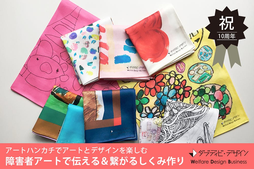 2018年、ダブディビ・デザインは「ART BRUTハンカチーフ」の商品企画に携わらせていただきました。全国の障害のある方のアート作品を原画にしたハンカチのデザインを行いました。この企画は、ブルーミング中西様からお声がけいただいたことをきっかけに始まりました。ブルーミング中西様は、このハンカチーフを通して、障害者アートの発信やアーティストの支援を行われました。