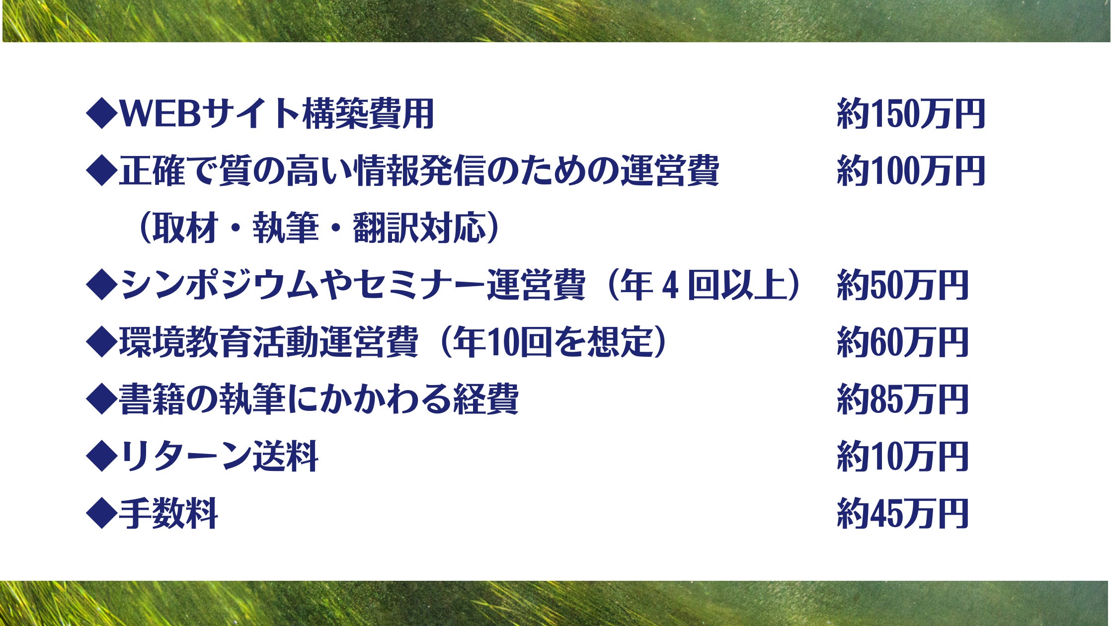今回のクラウドファンディングで集まった資金は、WEBサイトの構築と当面2年間を想定した情報発信とネットワーク運営を継続していくための人件費、環境教育の活動運営費等に使わせていただきます。