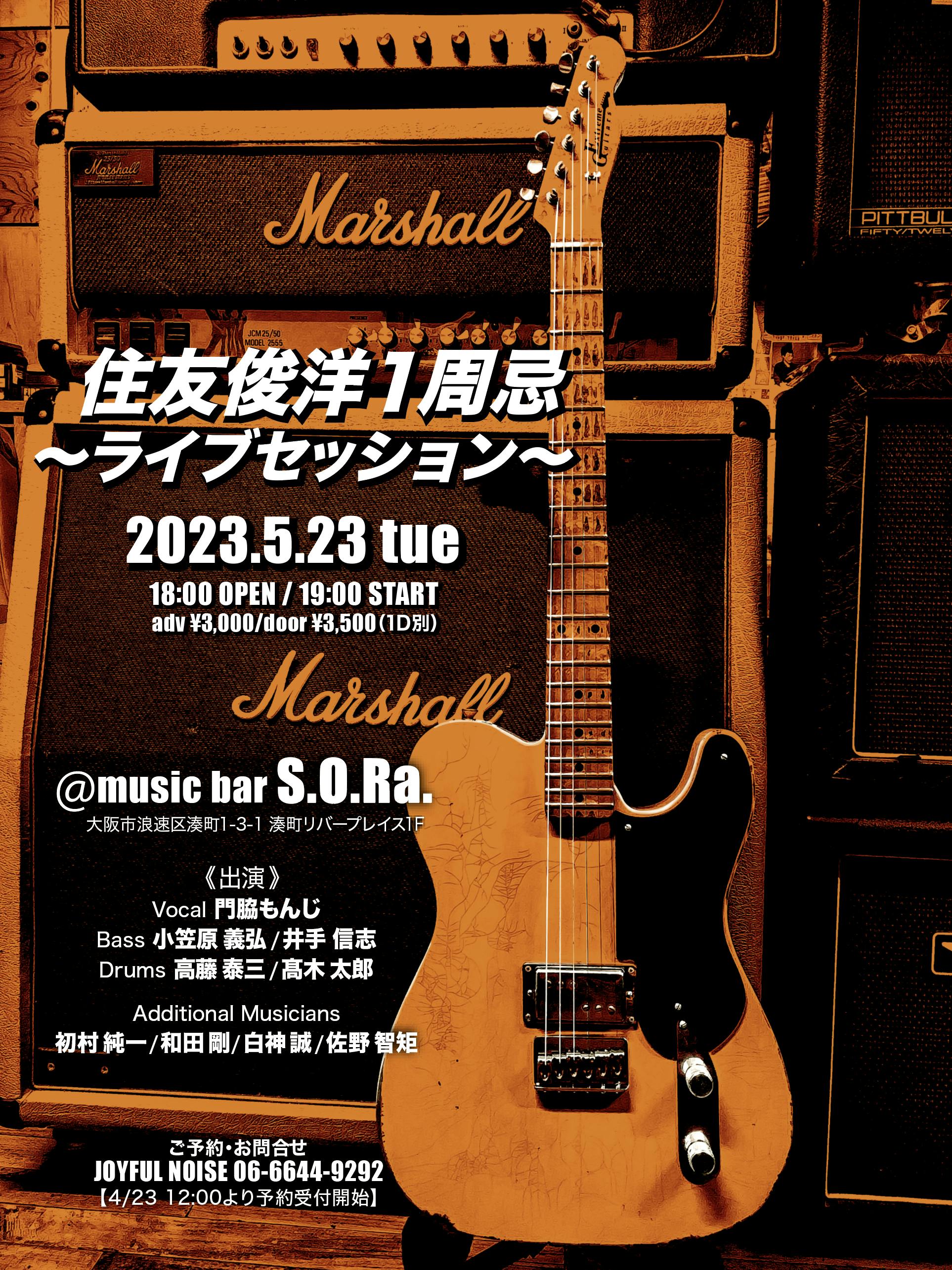 2023/04/18 18:47出演者追加!!『住友俊洋1周忌~ライブセッション~』いつも住友俊洋を応援してくださりありがとうございます。先日、5/23 住友1周忌の日に、住友のホームであるmusic bar S.O.Ra.にて住友を偲んでセッションライブを行いますよ!のお知らせメッセージをお届けしましたが、出演メンバーが追加となりましたのでお知らせ致します。きっと皆さんの大好きな曲や、聴いただけで涙腺崩壊の曲達が続々飛び出してくるはず…!ハンカチご持参でご参加くださいね!!!そしてご予約開始スタートは、いよいよ次の日曜日(4/23)12:00より。小さなお店ですので、ご希望の皆様全員にご参加頂けないかも知れませんが、ご希望の方は出来るだけお早めにご予約頂ければと思います。5/23、music bar S.O.Ra.にてお待ちしております!■ ■ ■ ■ ■ ■ ■ ■ ■『住友俊洋1周忌~ライブセッション~』■日程■2023年5月23日(火)■会場■music bar S.O.Ra. 大阪市浪速区湊町1-3-1 湊町リバープレイス1F■出演■■Vocal 門脇もんじ■Bass 小笠原 義弘 / 井手 信志■Drums 高藤 泰三 / 髙木 太郎■Additional Musicians初村 純一 / 和田 剛 / 白神 誠 / 佐野 智矩■時間■18:00 Open / 19:00 Start■料金■前売¥3,000 / 当日¥3,500(1ドリンク別途要)■ご予約受付開始:4月23日(日) 12:00~■ご予約・お問い合わせ:JOYFUL NOISE 06-6644-9292(11:00~20:00)※ご予約の際皆様のお名前をお聞きしますので、フルネームが分かる状態でお電話ください※ご予約はお電話のみの受付とさせて頂きます■ ■ ■ ■ ■ ■ ■ ■ ■ もっと見る『住友俊洋1周忌~ライブセッション~』のお知らせ