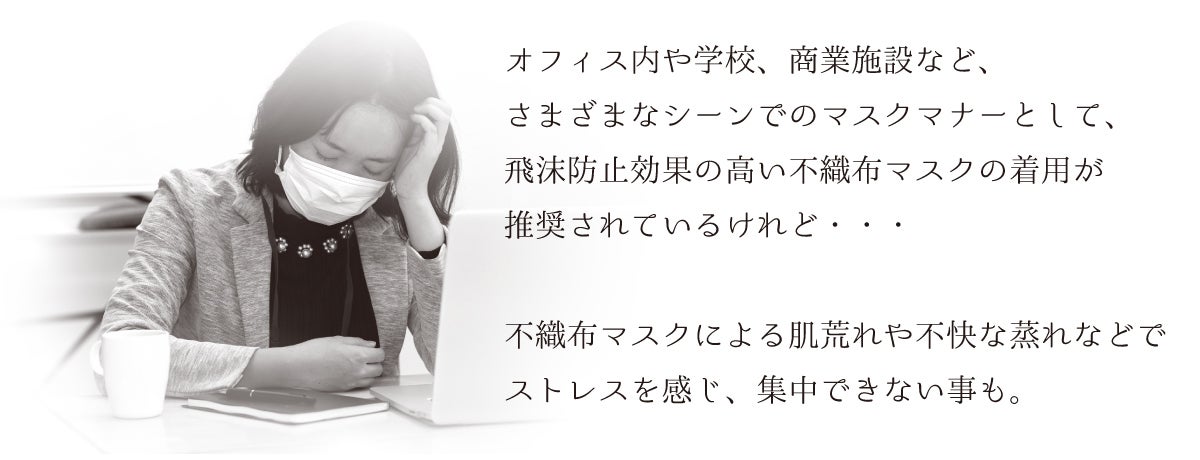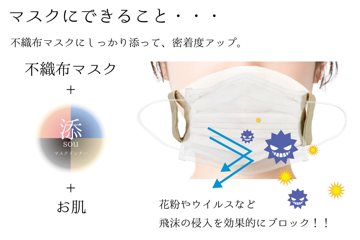 添souは、不織布マスクとお顔の間に入るインナーマスク。しっかり添って着用感は抜群。不織布マスクをしたまま話したり作業したすると、マスクがお肌に擦れたり、吸い付いたりと、不快感が募ります。添souのふんわりさらさらのガーゼが優しくお肌にあたり、真ん中に入ったワイヤーがマスク内に適度な空間を作ってくれるので、マスクを着用し続けていても呼吸がしやすく快適に過ごせます。