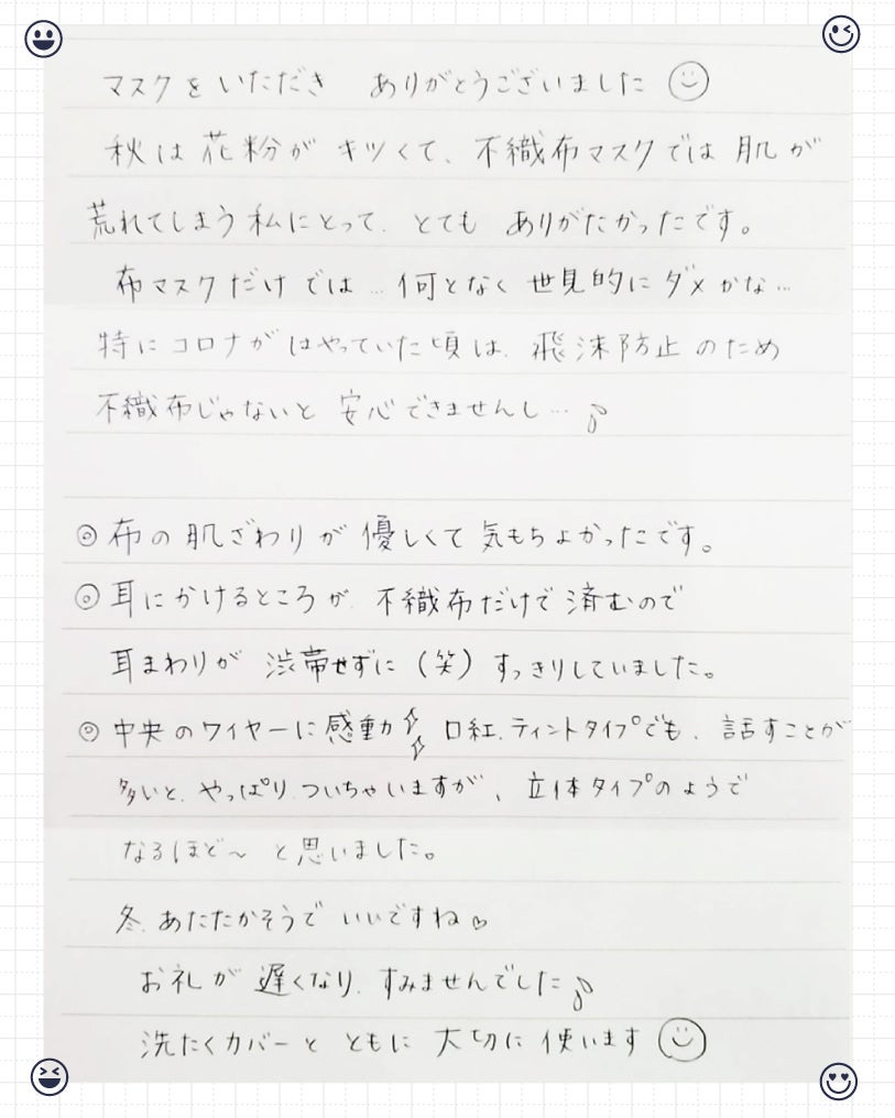 マスクが欠かせない世の中で少しでも役に立ちたいという想いから、さまざまな機能面と使い心地にこだわったやさしい商品をお届けしたいと願います。