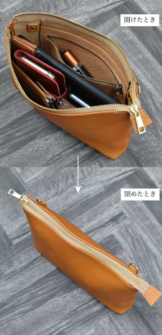 しかしミニクラッチの容量では長財布が収納できないなど、少し物足りないので、見た目はスマートながらも満足できる収納力を実現しました。