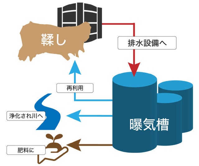 栃木レザーには大規模な排水設備が用意されています。9つの区画に分けれらた槽で、バクテリアや微生物によって段階的に汚水を中和させていきます。最終的に浄化された水の3分の1は原皮洗いに再利用され、それ以外は近くの河川に戻されます。