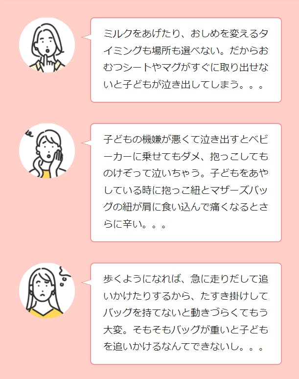 子どもが泣かないようにあやすためのおもちゃをすぐバッグから取らないといけないとか、