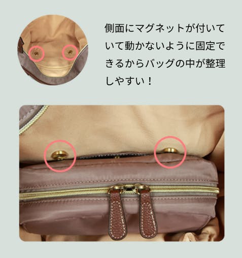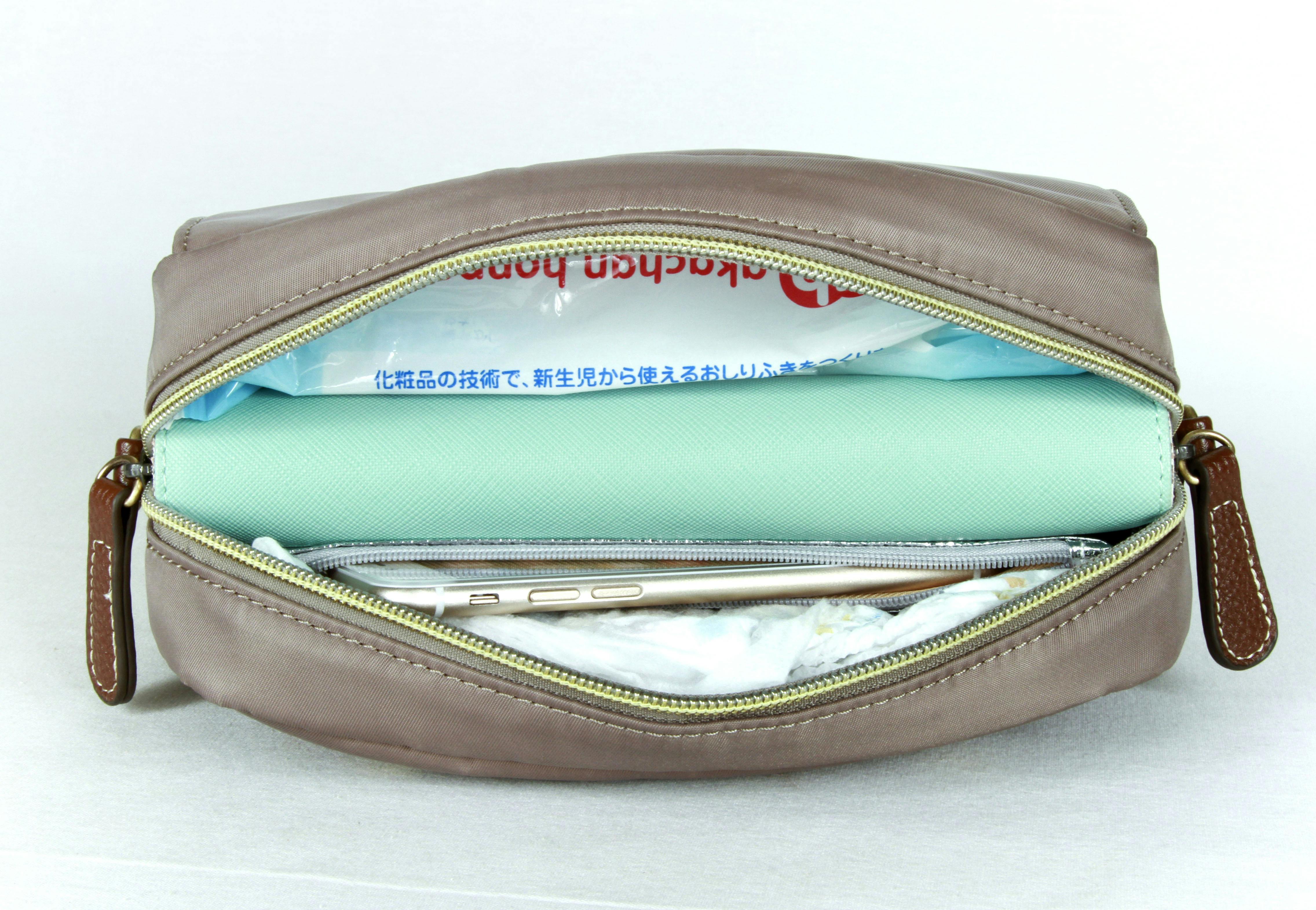バッグが傾いても物が落ちにくいうえに、必要な時にはすぐに取り出せるようになっております。