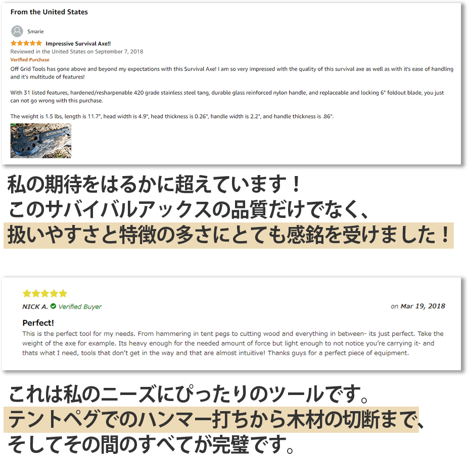 ・ サバイバルアックスを目的無く携帯していたことで銃刀法違反となった場合でも当社は責任を負いかねますので、用途に応じてご使用ください。